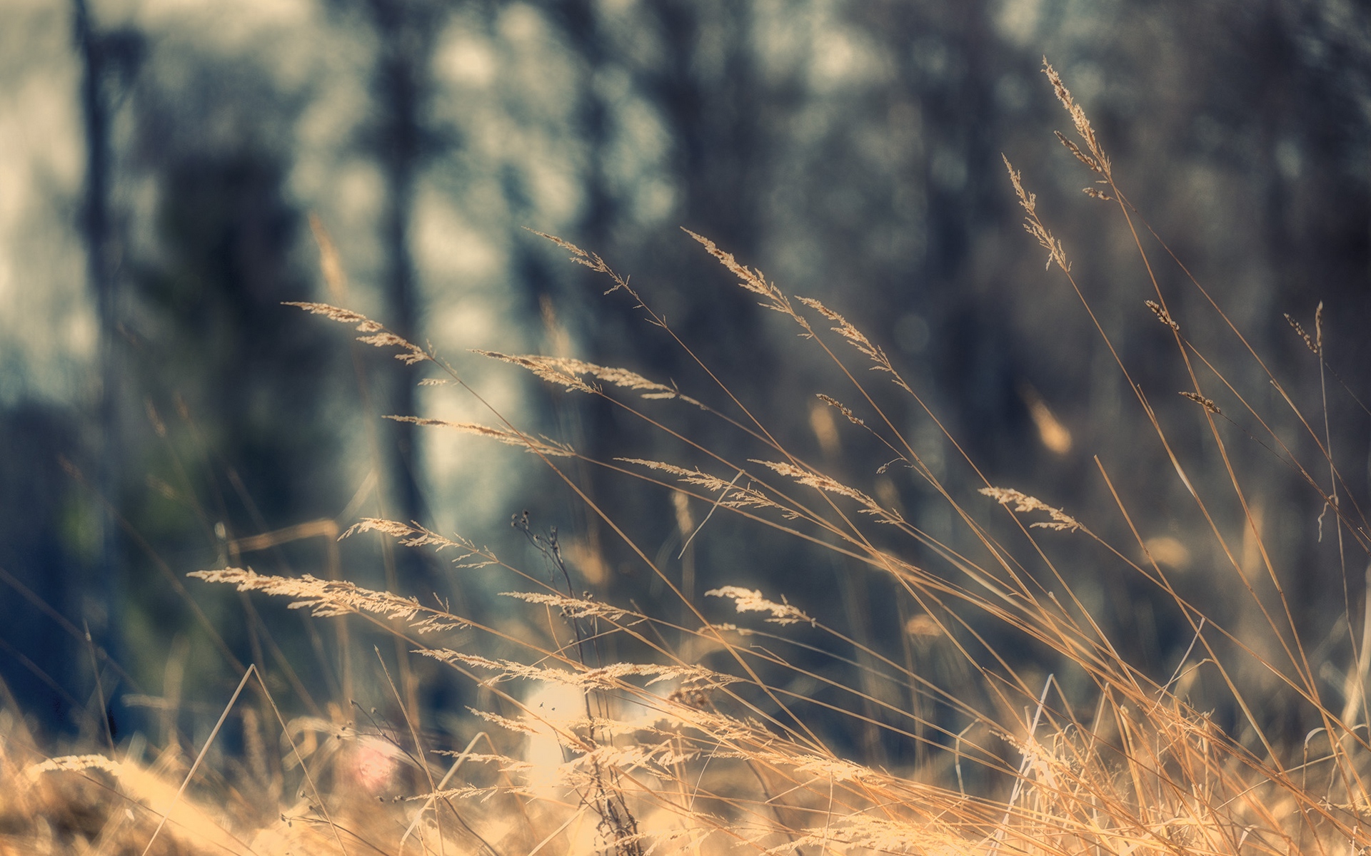 Description: A field of tall grass with trees in the background and sunlight shining through the grass on the ground and in the foreground.