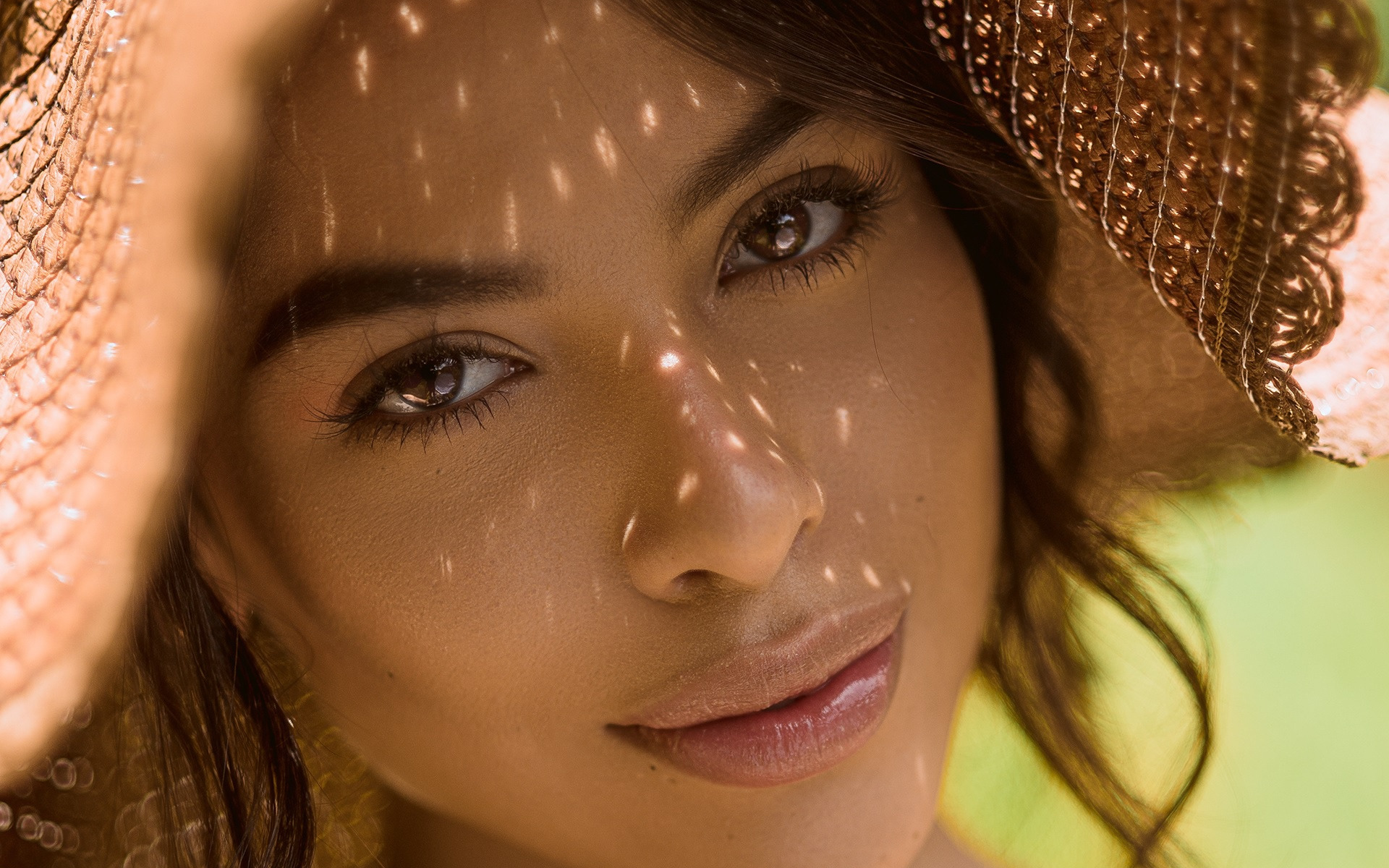 Description: A woman with a hat on her head and a green background behind her is a sunlit face and a shadow of her hat.
