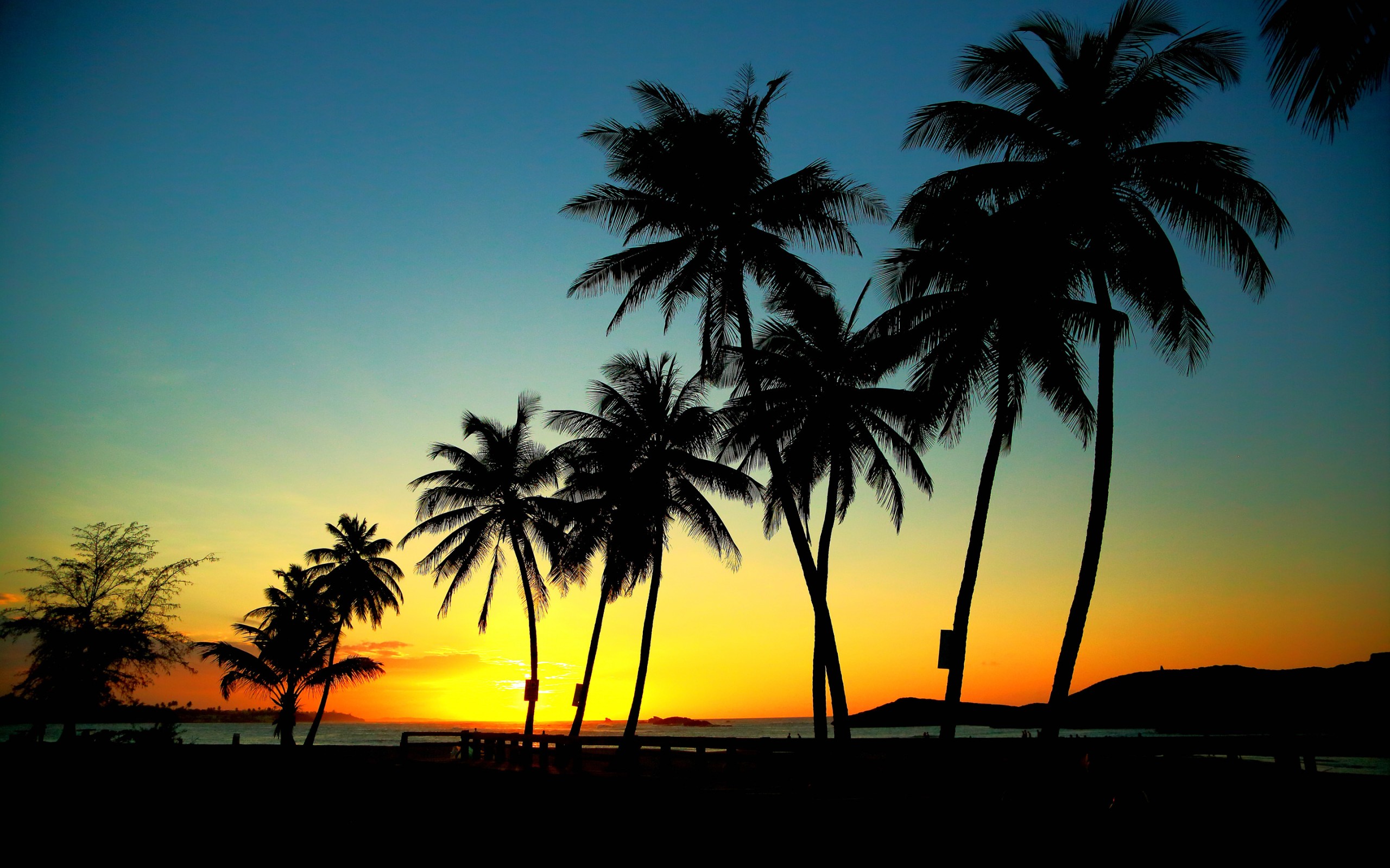 Description: A sunset with palm trees and a beach in the background with a person walking on the beach in the foreground.