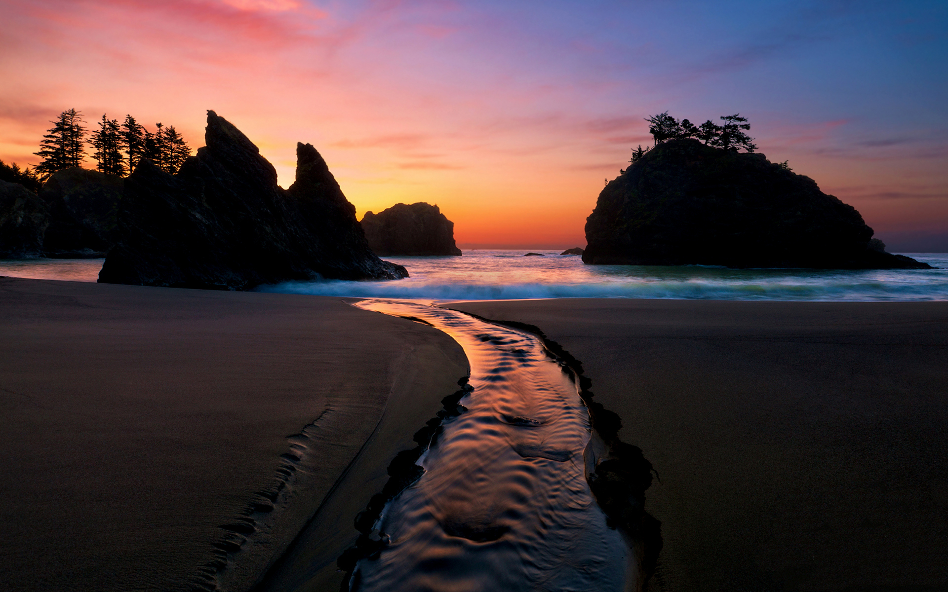 Description: A sunset view of a beach with a small stream running through the sand and trees in the background.