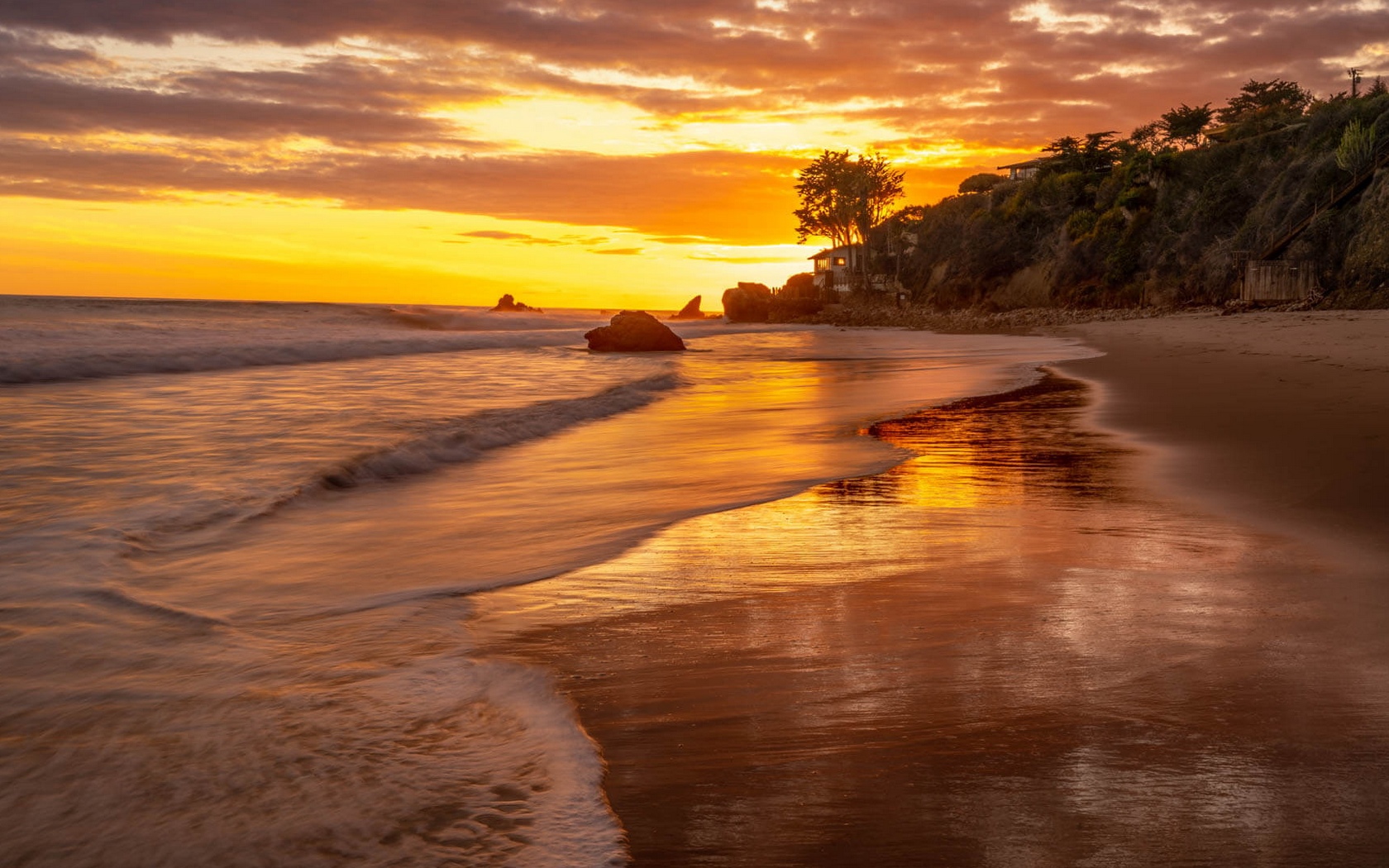 Description: A sunset on a beach with waves coming in and a tree line in the background and a rock outcropping in the foreground.