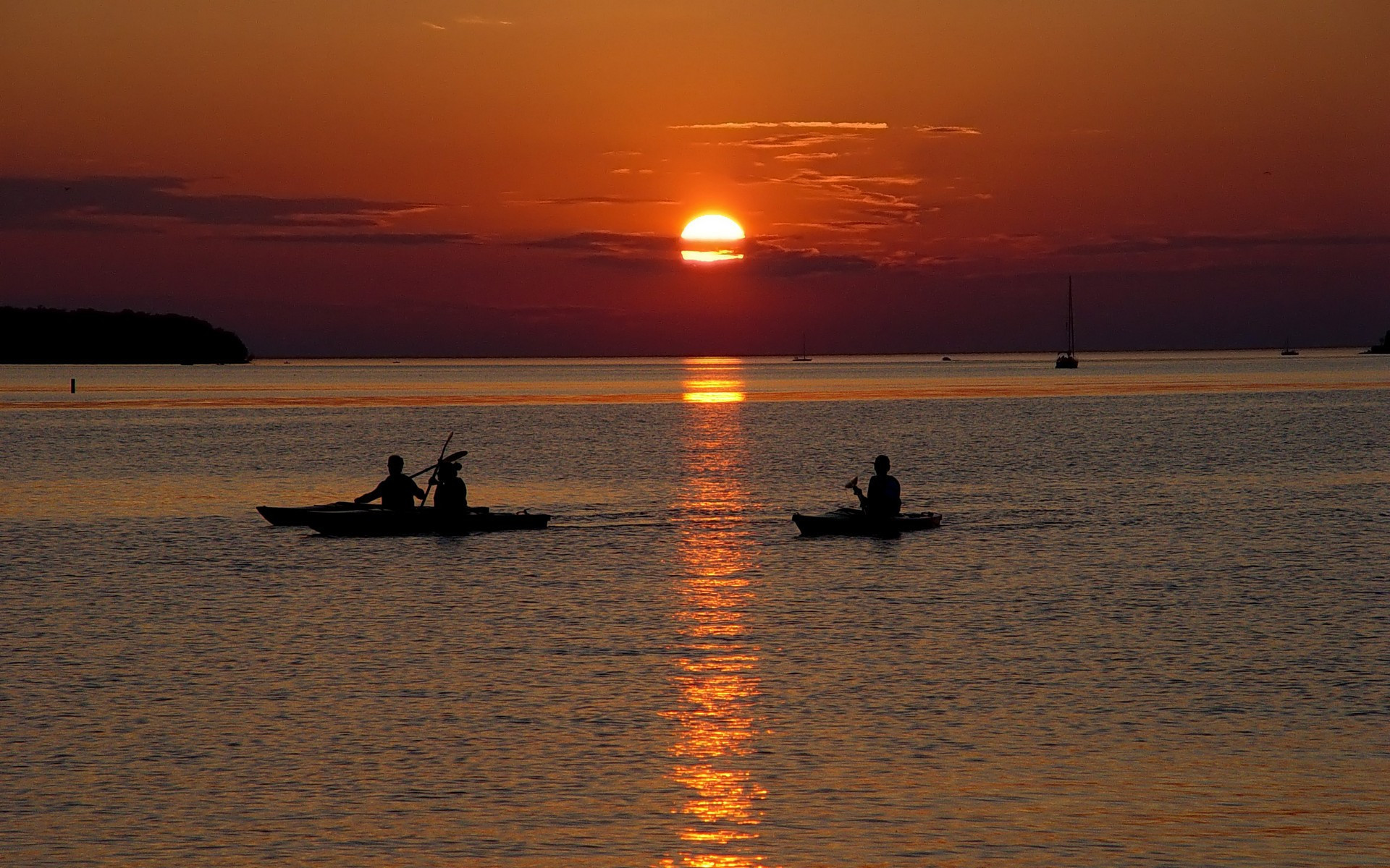 Description: Two people in a boat on a body of water at sunset with the sun setting in the background and a few boats in the water.