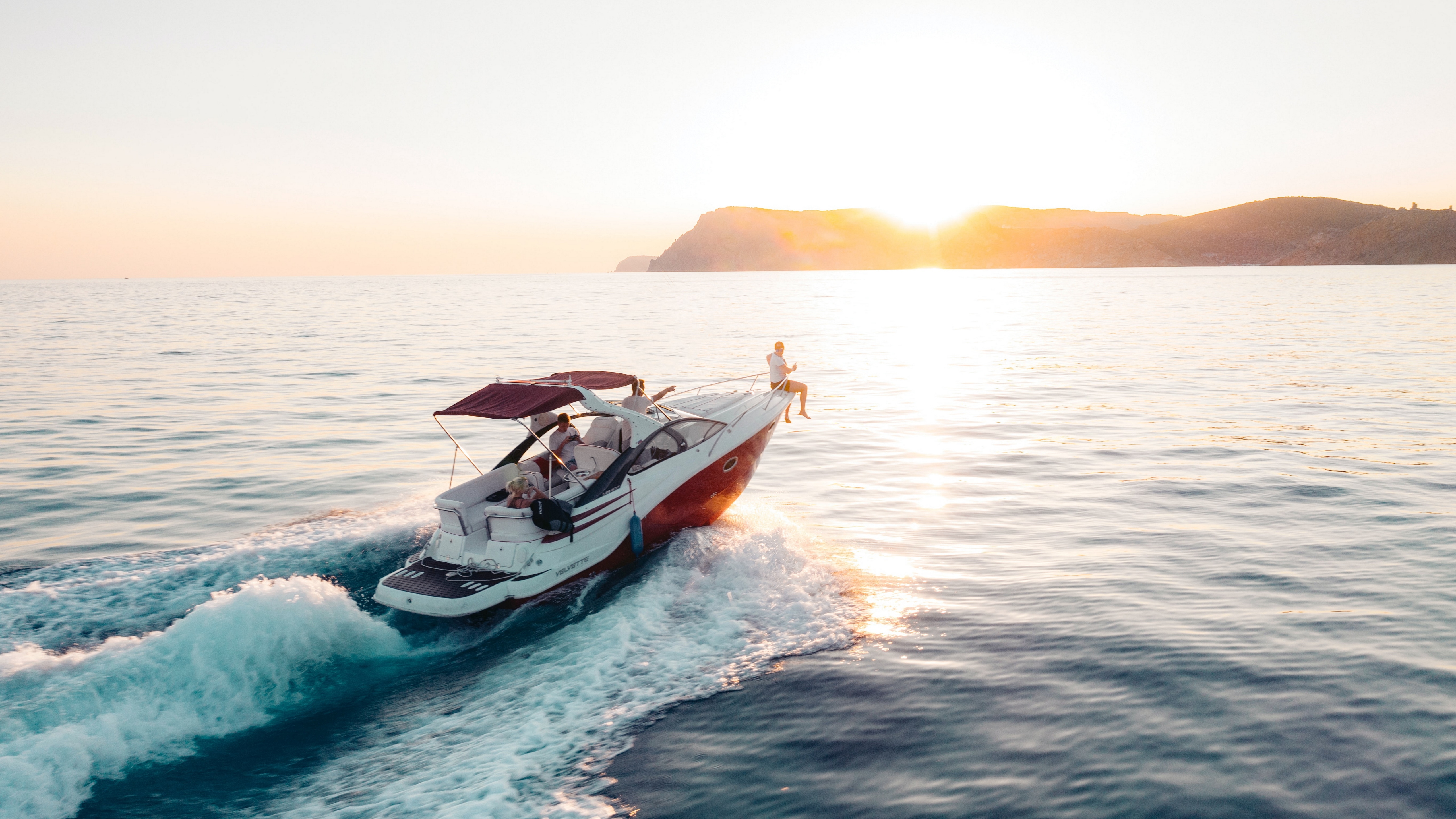 Description: A boat is traveling through the water at sunset or dawn with a person on the back of the boat.