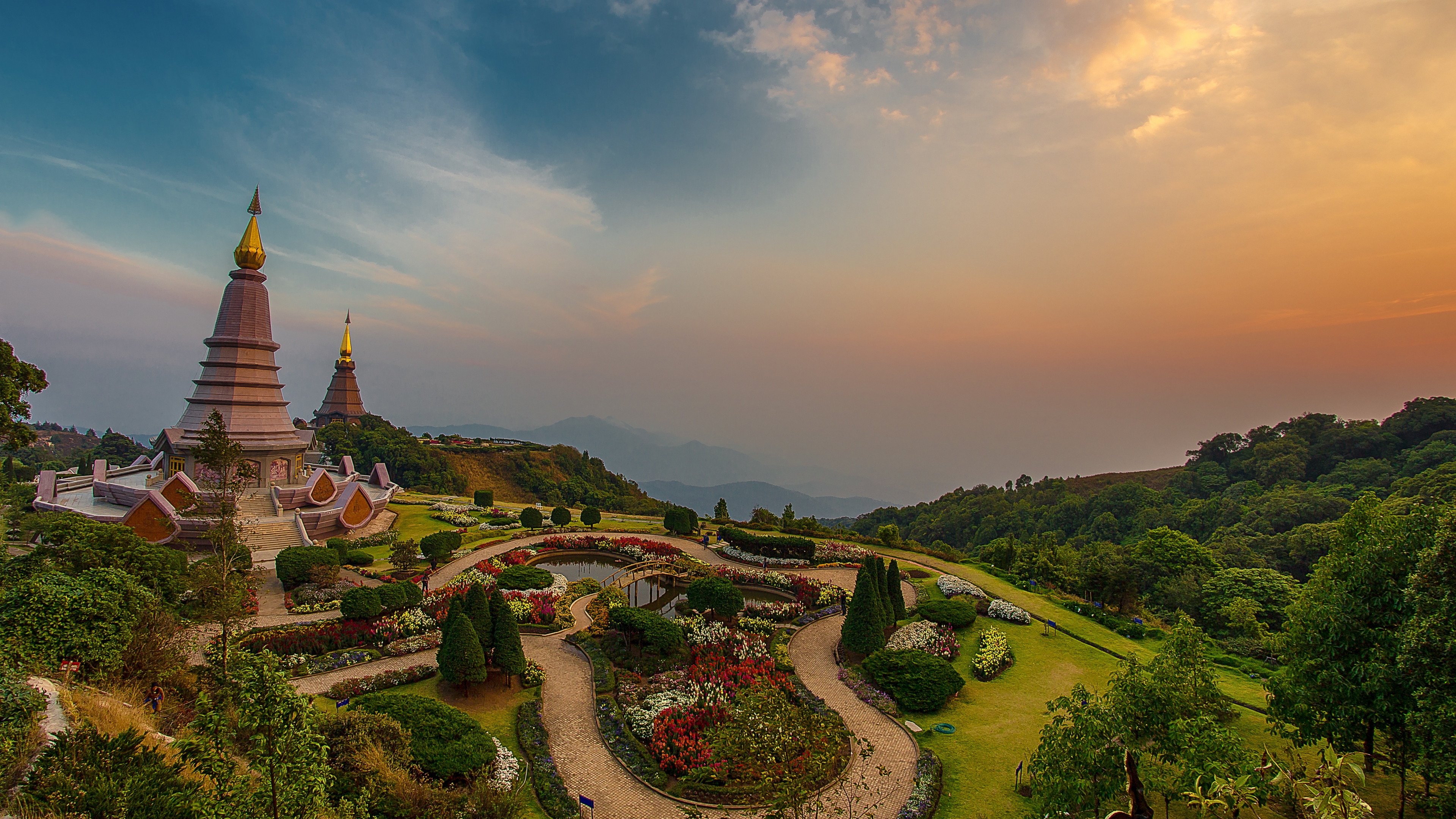 Description: A beautiful view of a large building with a garden in front of it at sunset or dawn with a sky background.