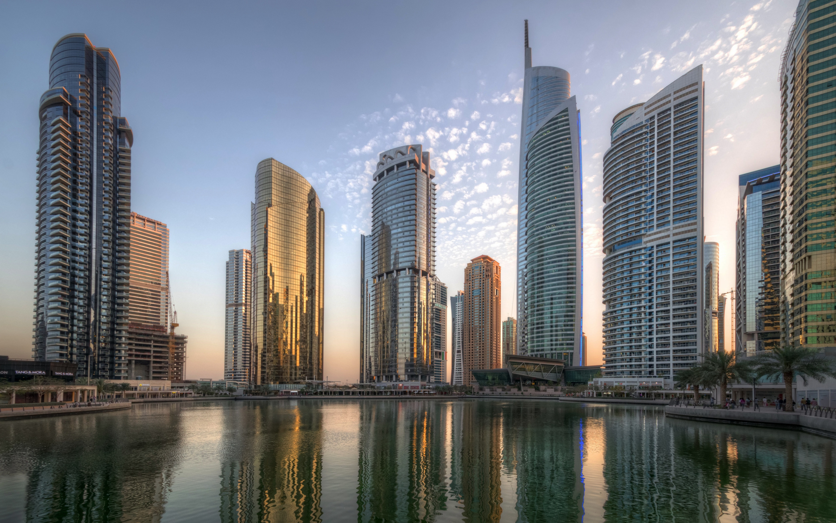 Description: A city with a lake in front of it and tall buildings in the background at sunset or dawn with a few clouds.