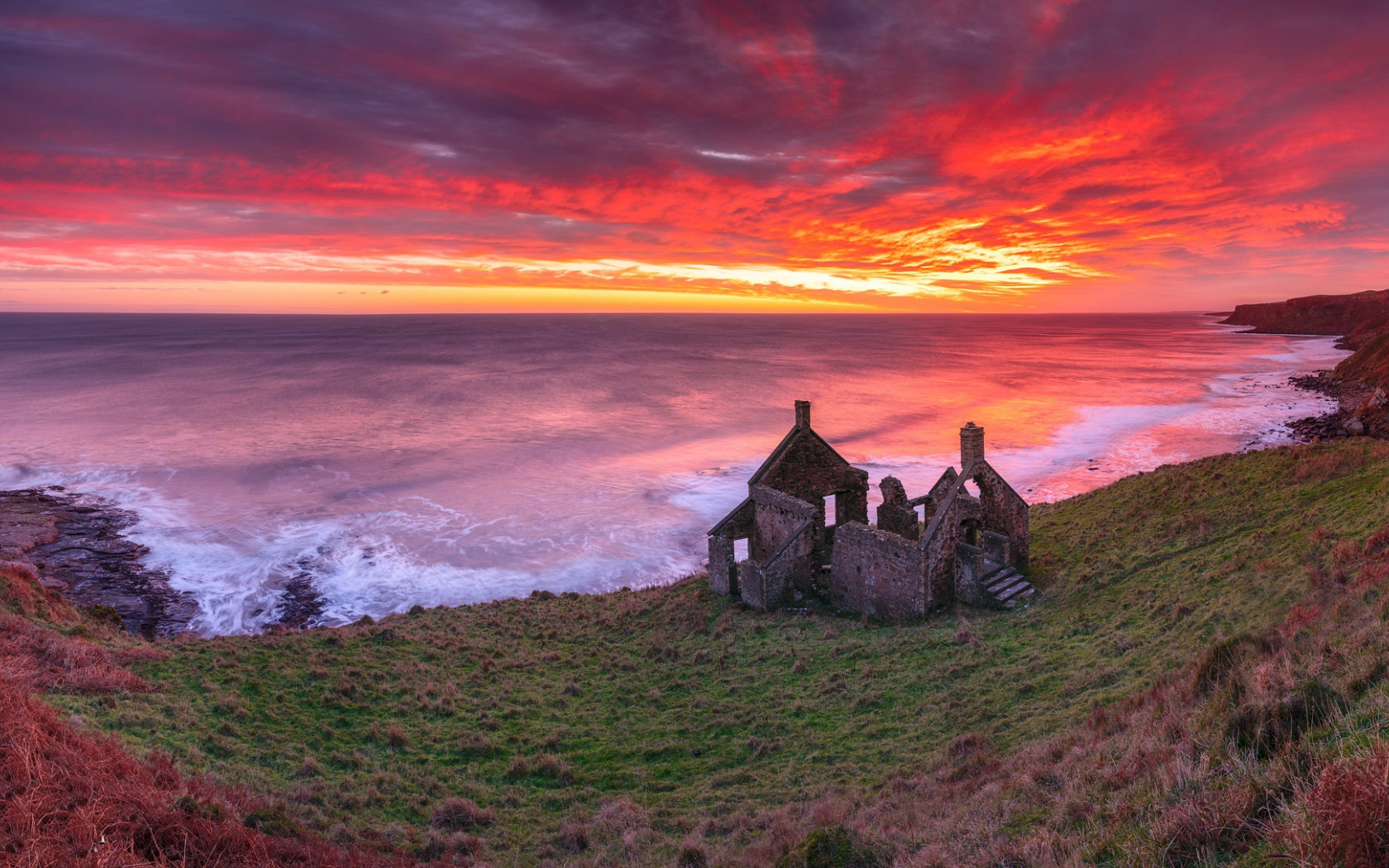 Description: A sunset over a rocky cliff with a small church on the edge of the cliff and a body of water in the distance.