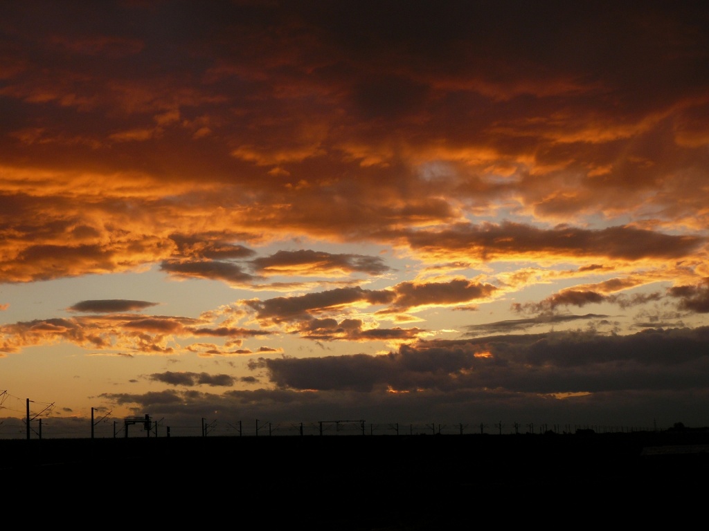 Description: A sunset with a few clouds in the sky and a fence in the foreground with a field in the foreground.