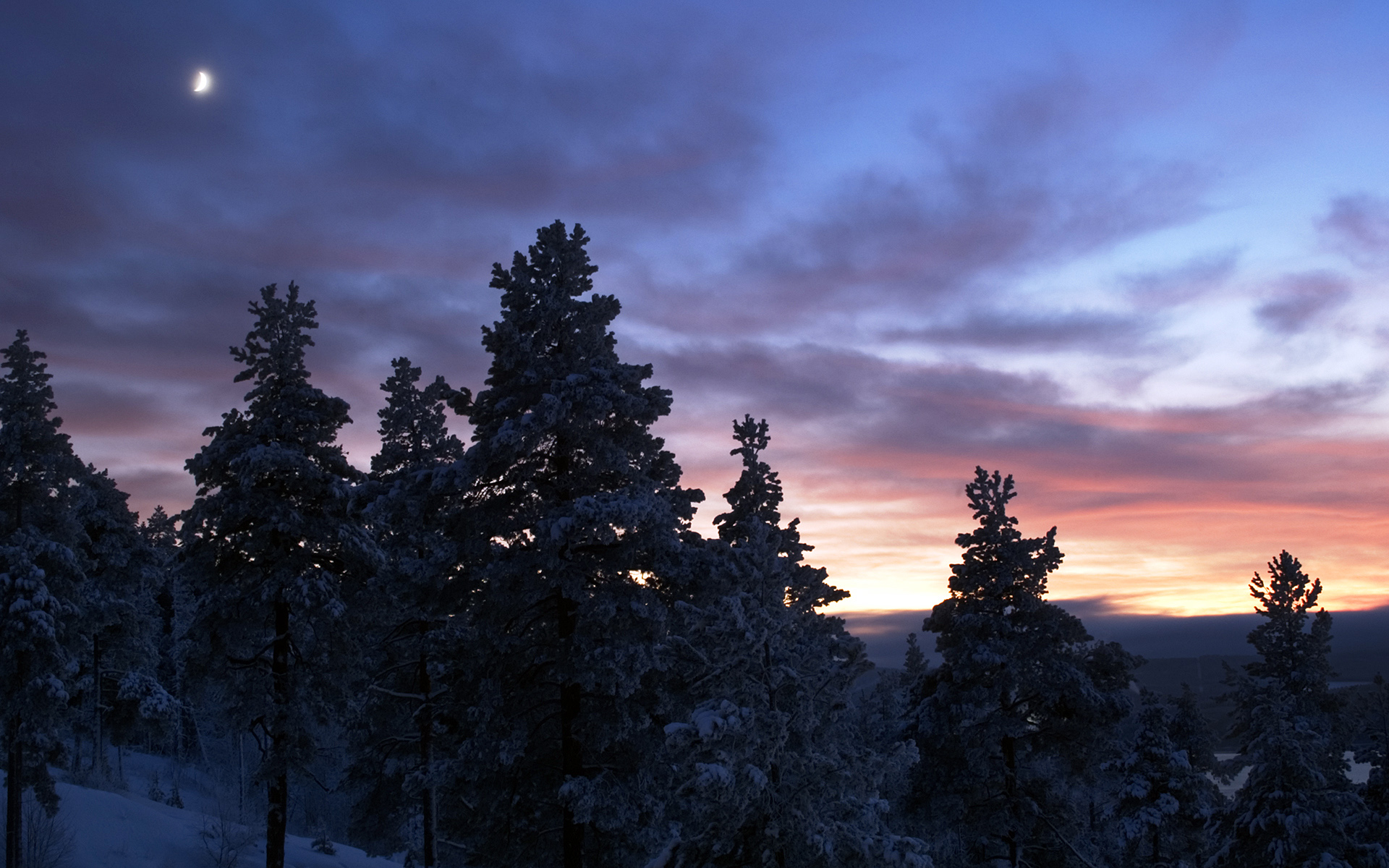 Description: A sunset with a few clouds and trees in the foreground and a moon in the distance in the distance.
