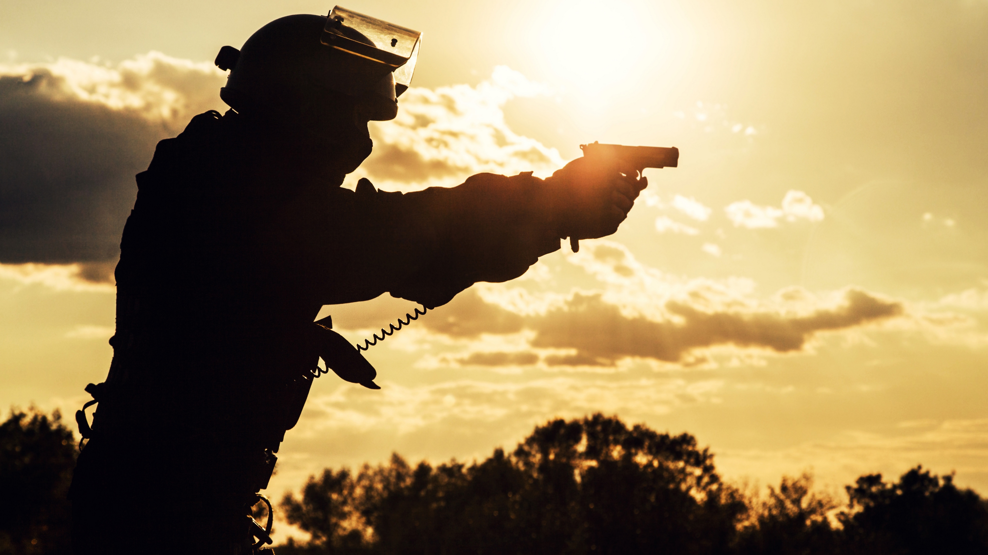 Description: A man holding a gun in his hand while standing in front of a sunset with clouds and trees in the background.
