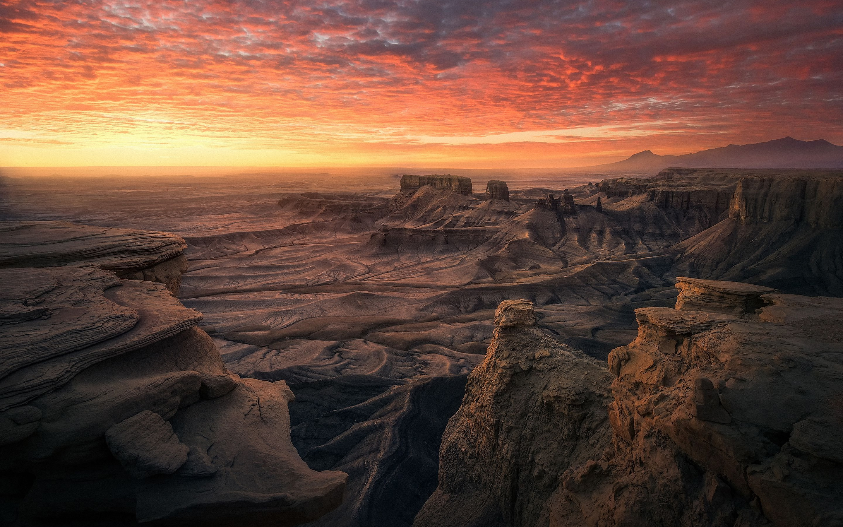 Description: A sunset over a desert with a mountain range in the background and a red sky with clouds above it.