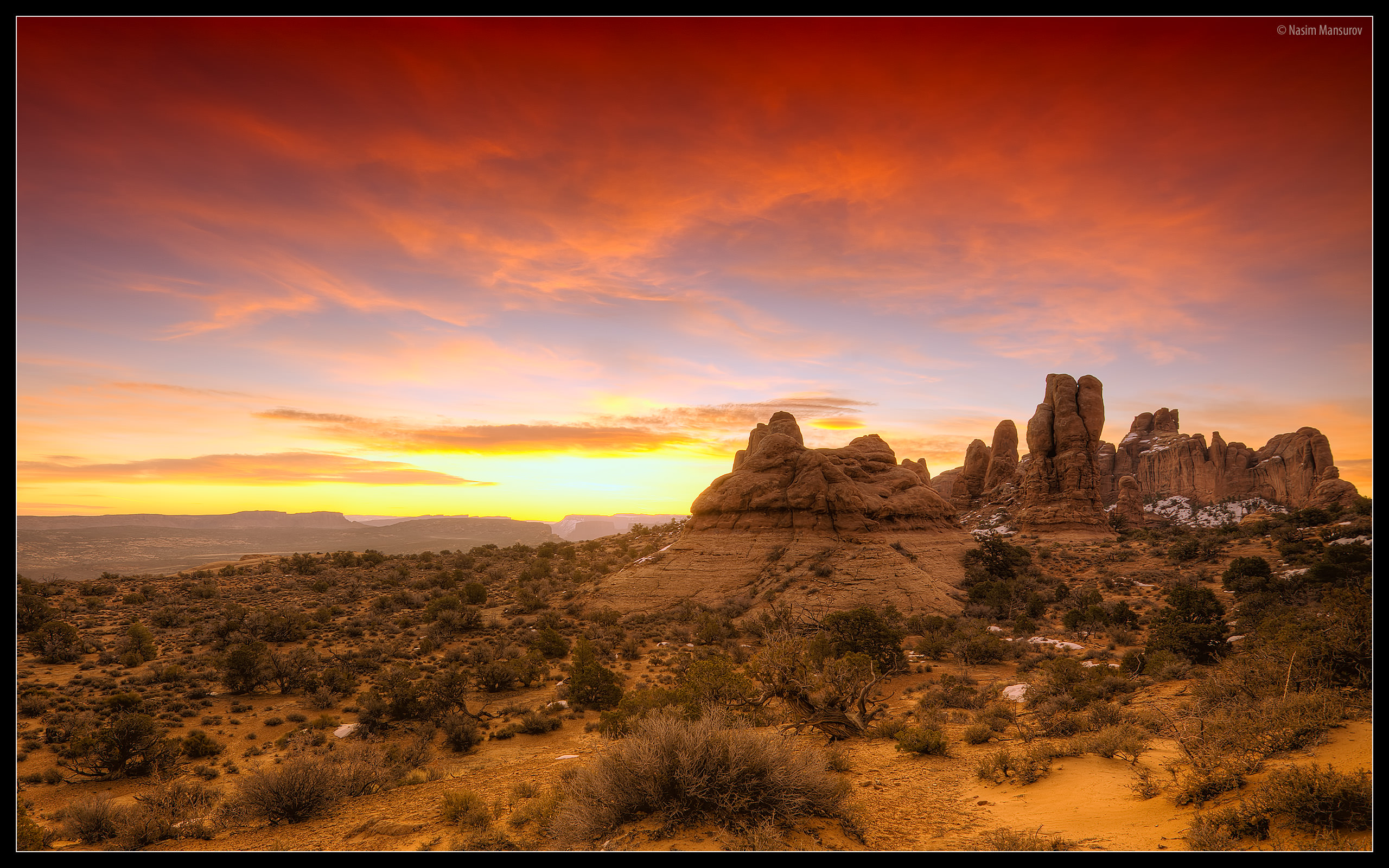 Description: A sunset over a desert with rocks and bushes in the foreground and a red sky in the background.