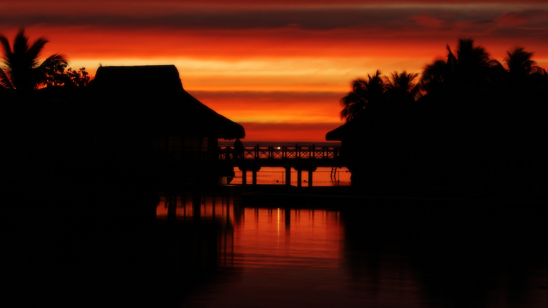 Description: A sunset with a dock and a house in the background with palm trees in the foreground and a red sky.