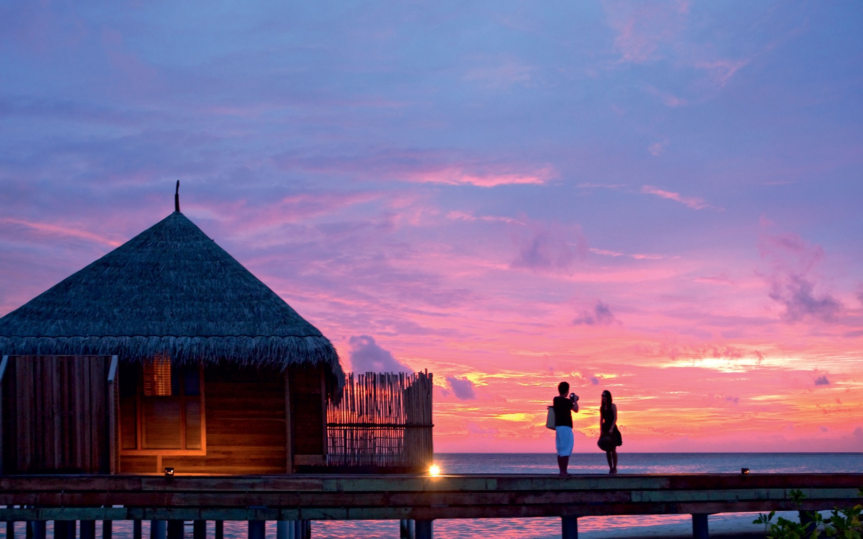 Description: Two people standing on a dock watching the sunset over the ocean with a hut in the background and a pier in the foreground.
