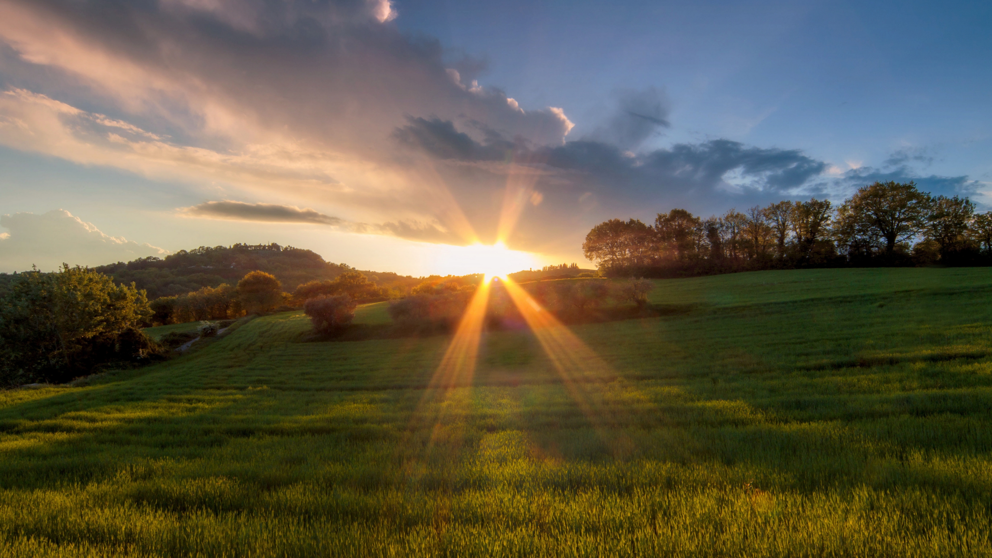 Description: A field with a sun setting in the background and clouds in the sky above it.