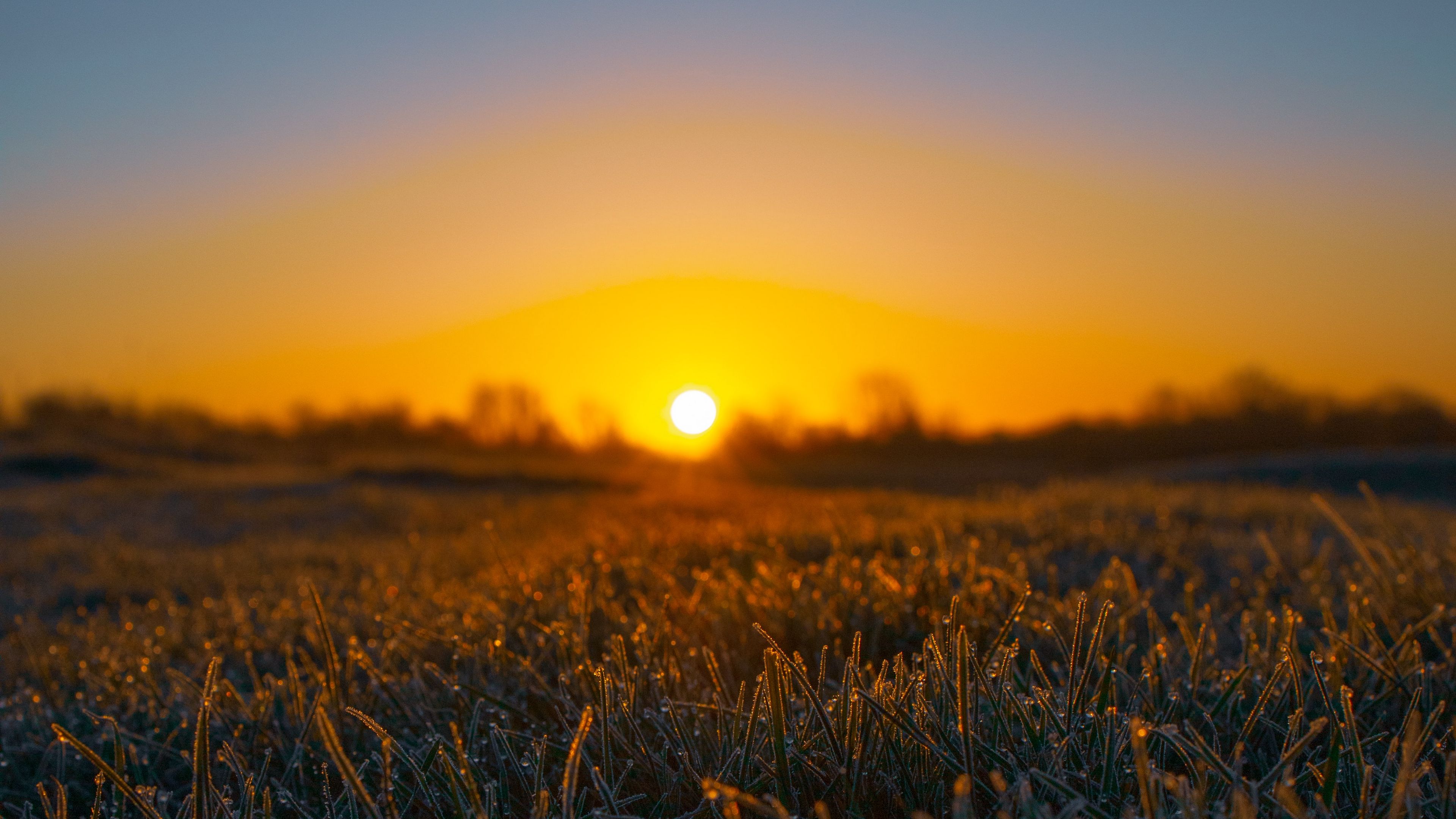 Description: A sunset over a field with grass and trees in the background and a bright yellow sun in the distance.