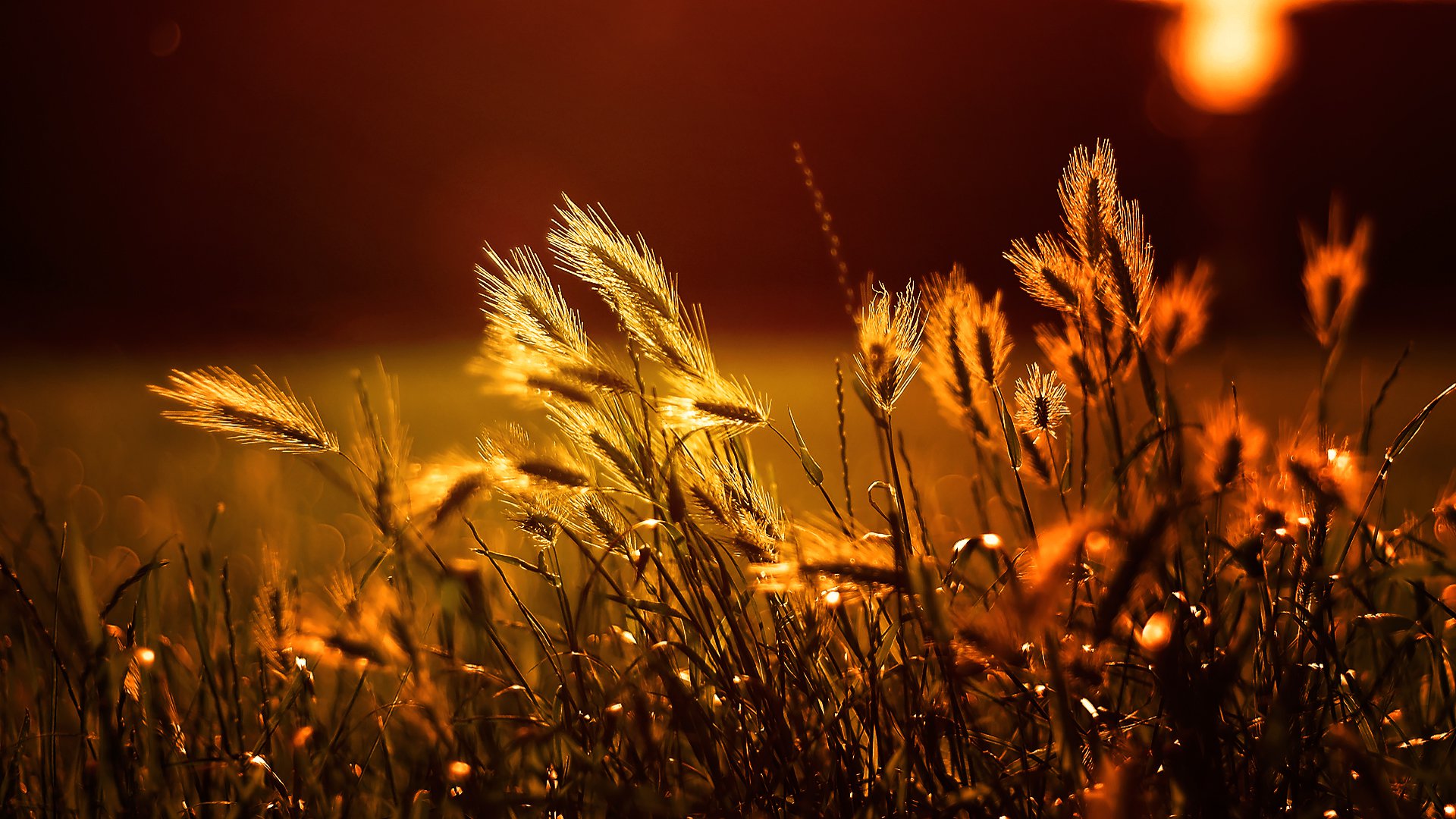 Description: A field of grass with the sun shining in the background and a red sky in the background with a few clouds.