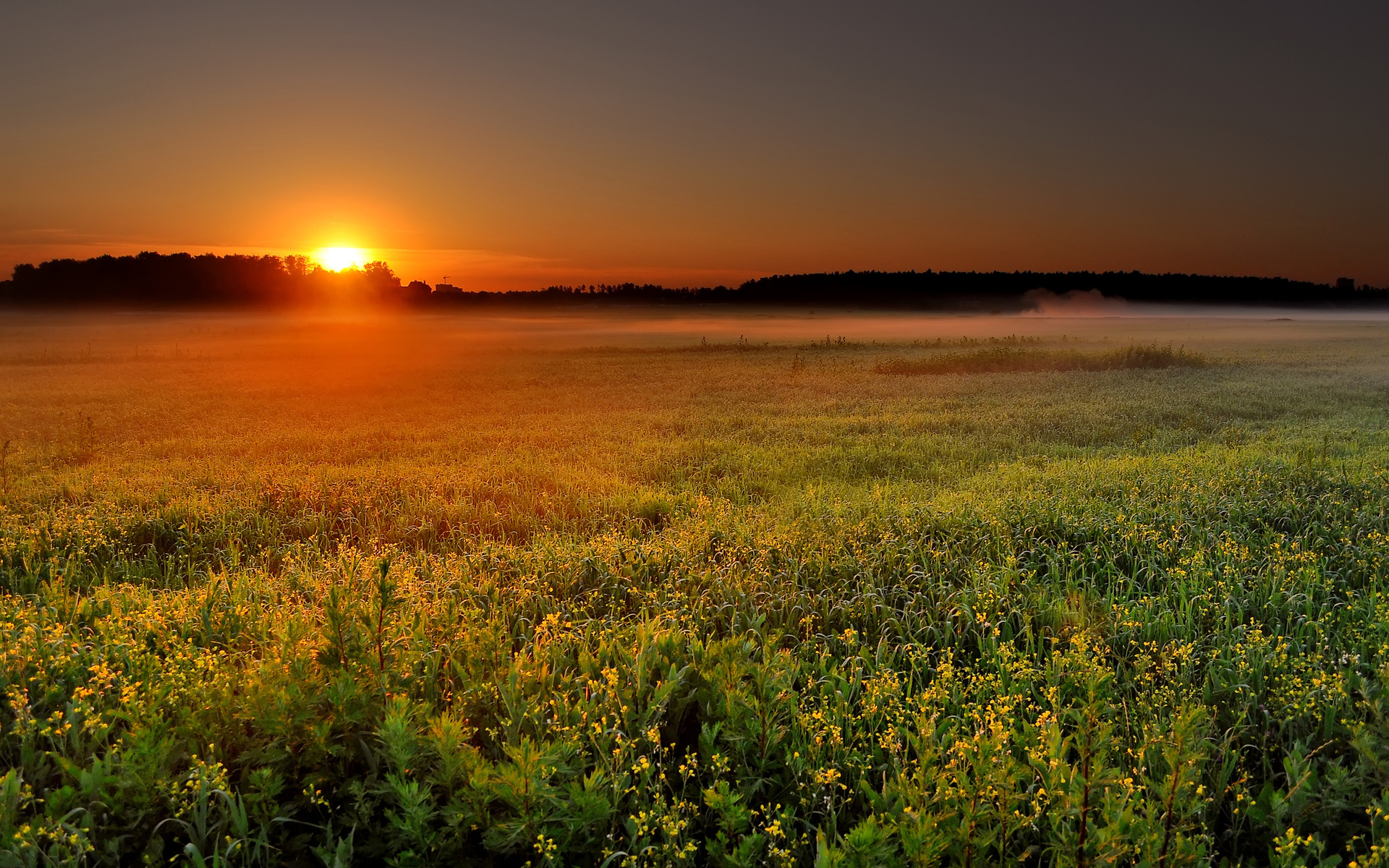 Description: A field with a sun setting in the distance and fog in the air above it and a field of yellow flowers.