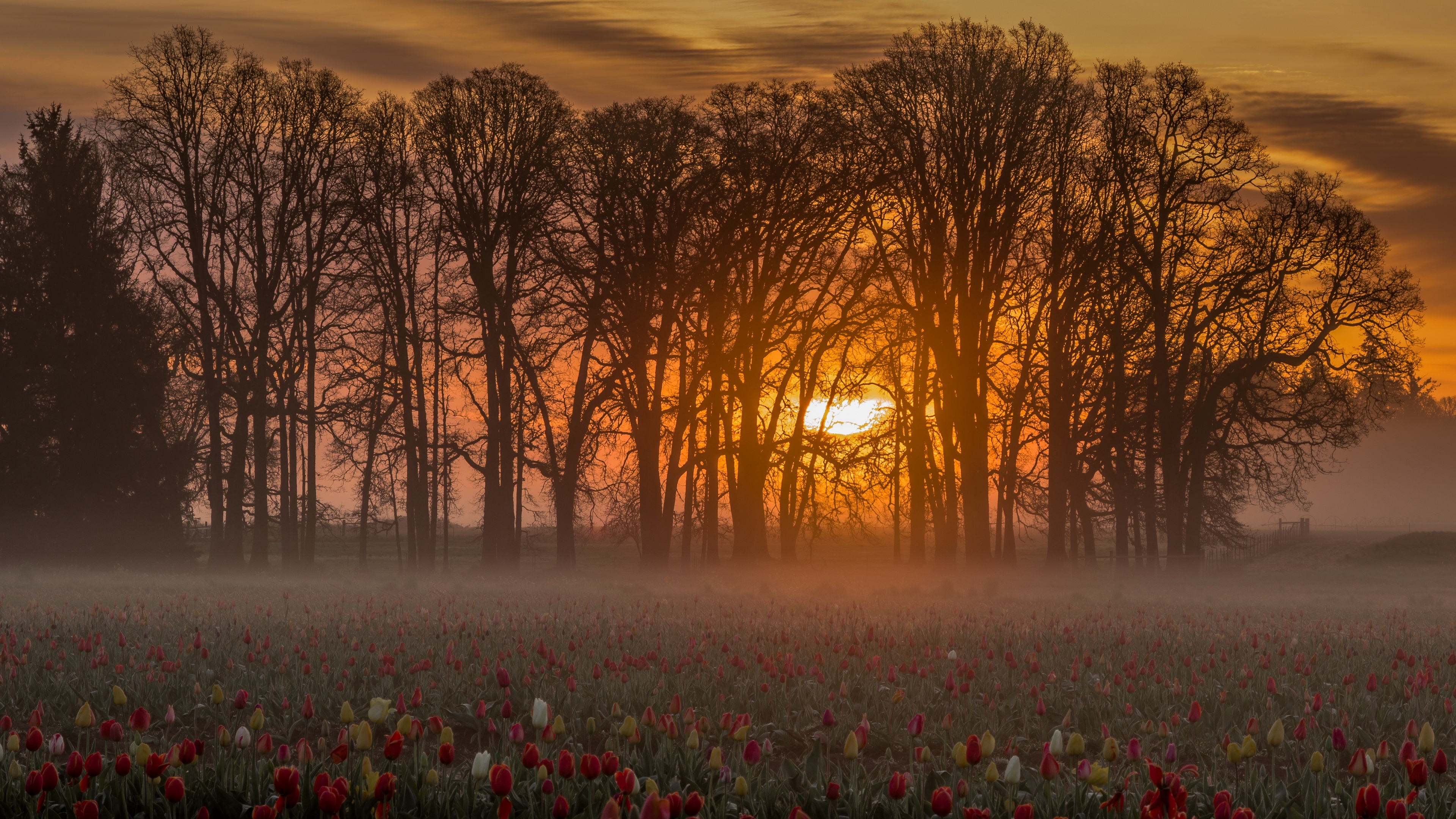 Description: A field with a sun setting behind some trees and flowers in the foreground and a foggy sky.