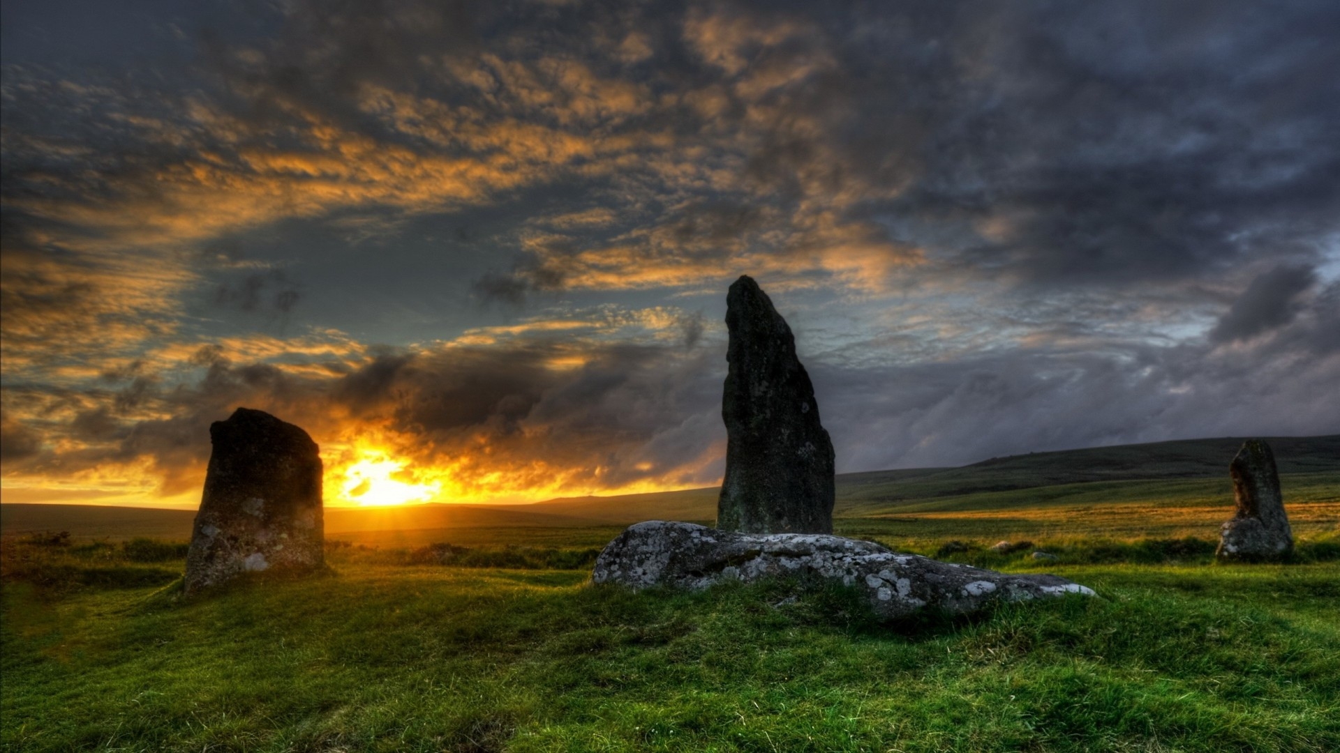 Description: A sunset over a grassy field with a large rock formation in the foreground and a few large rocks in the foreground.