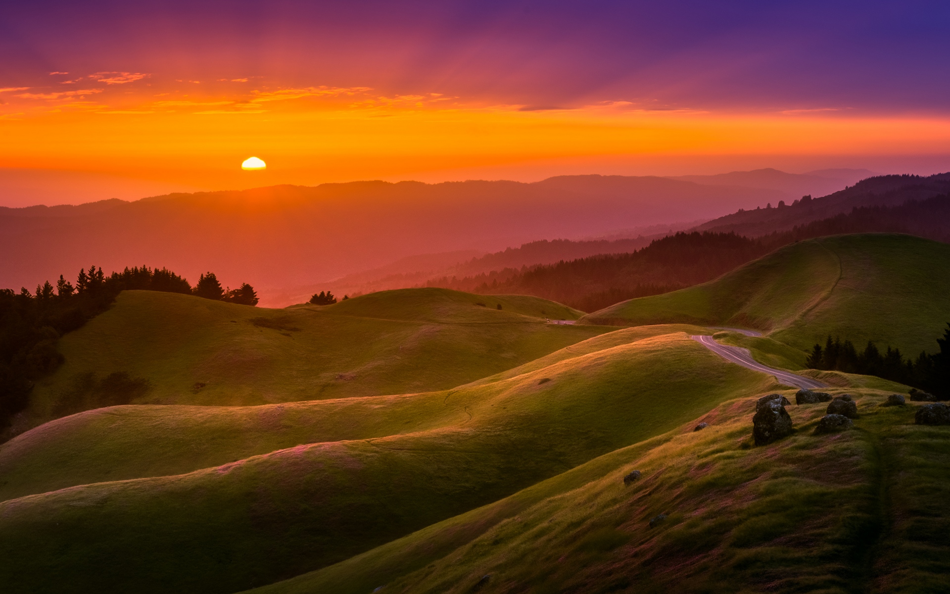 Description: A sunset over a grassy hill with a road going through it and a few trees on the hillside below.