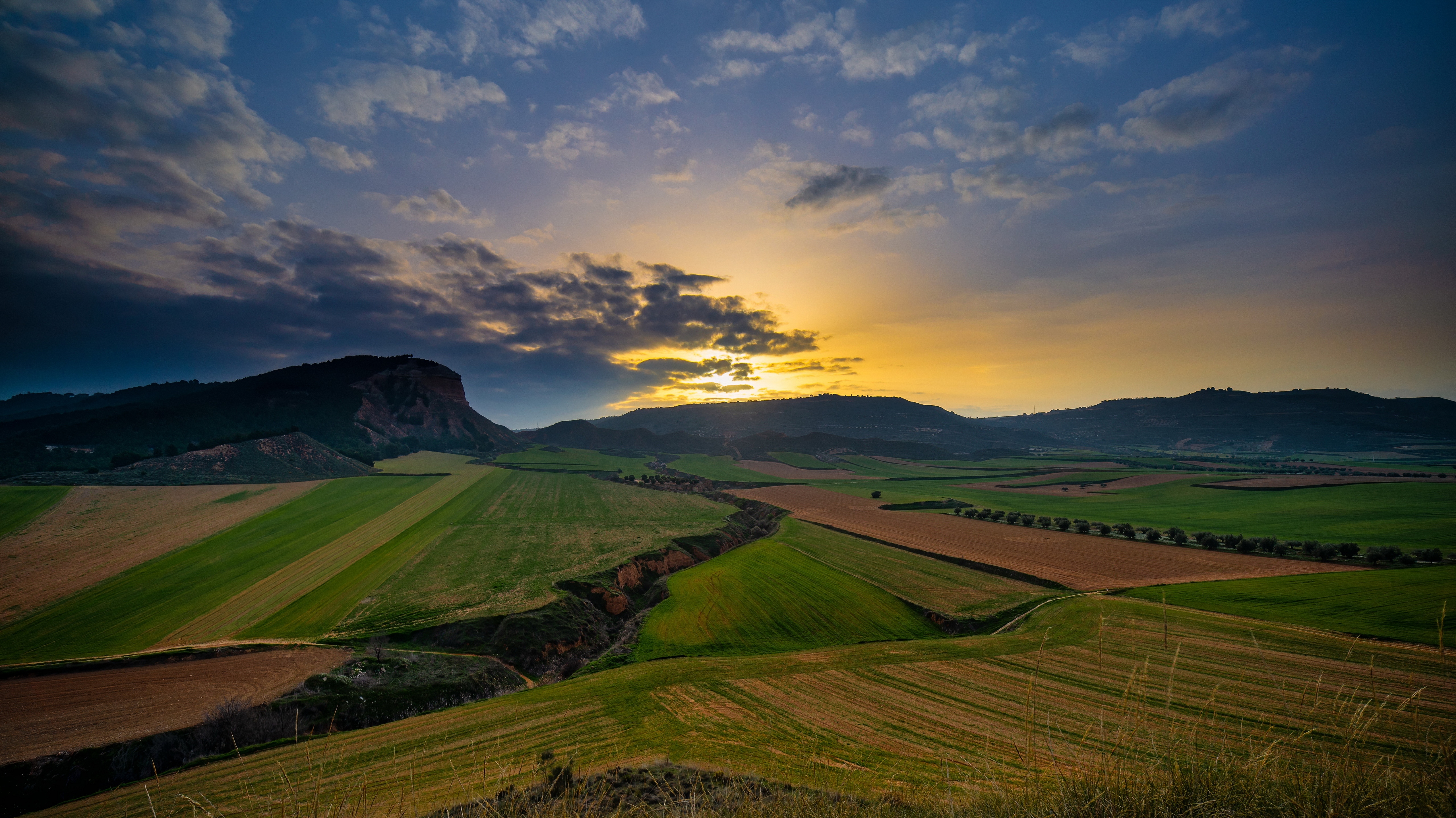 Description: A beautiful sunset over a green field with mountains in the background and a cloudy sky above it.