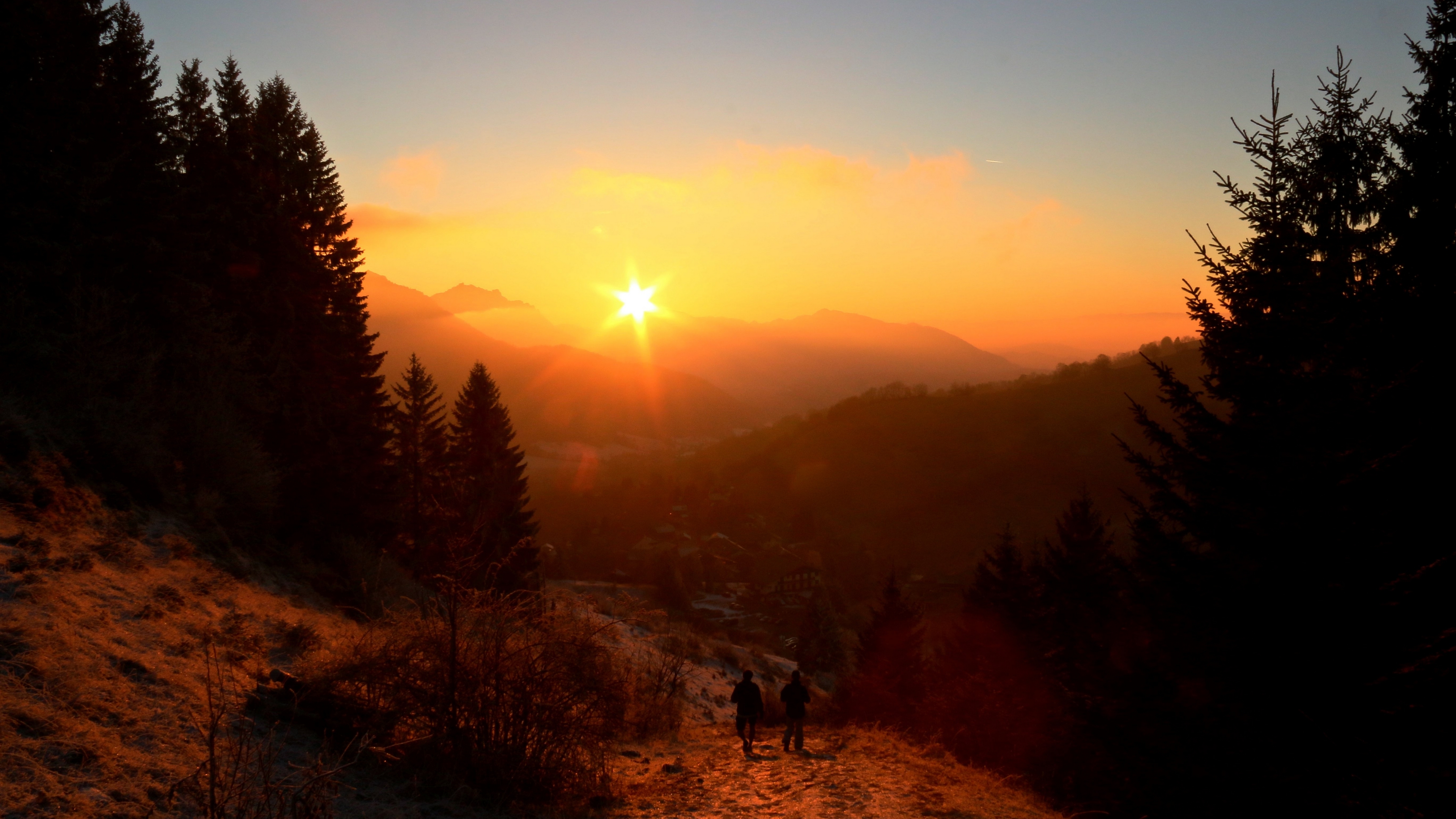 Description: A couple of people walking up a hill at sunset with the sun setting in the distance behind them and the mountains in the distance.