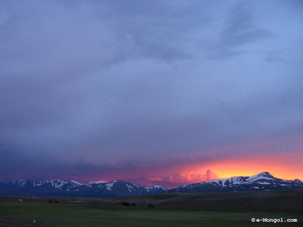 Description: A sunset with a few horses grazing in the field below it and mountains in the distance with snow on the tops.