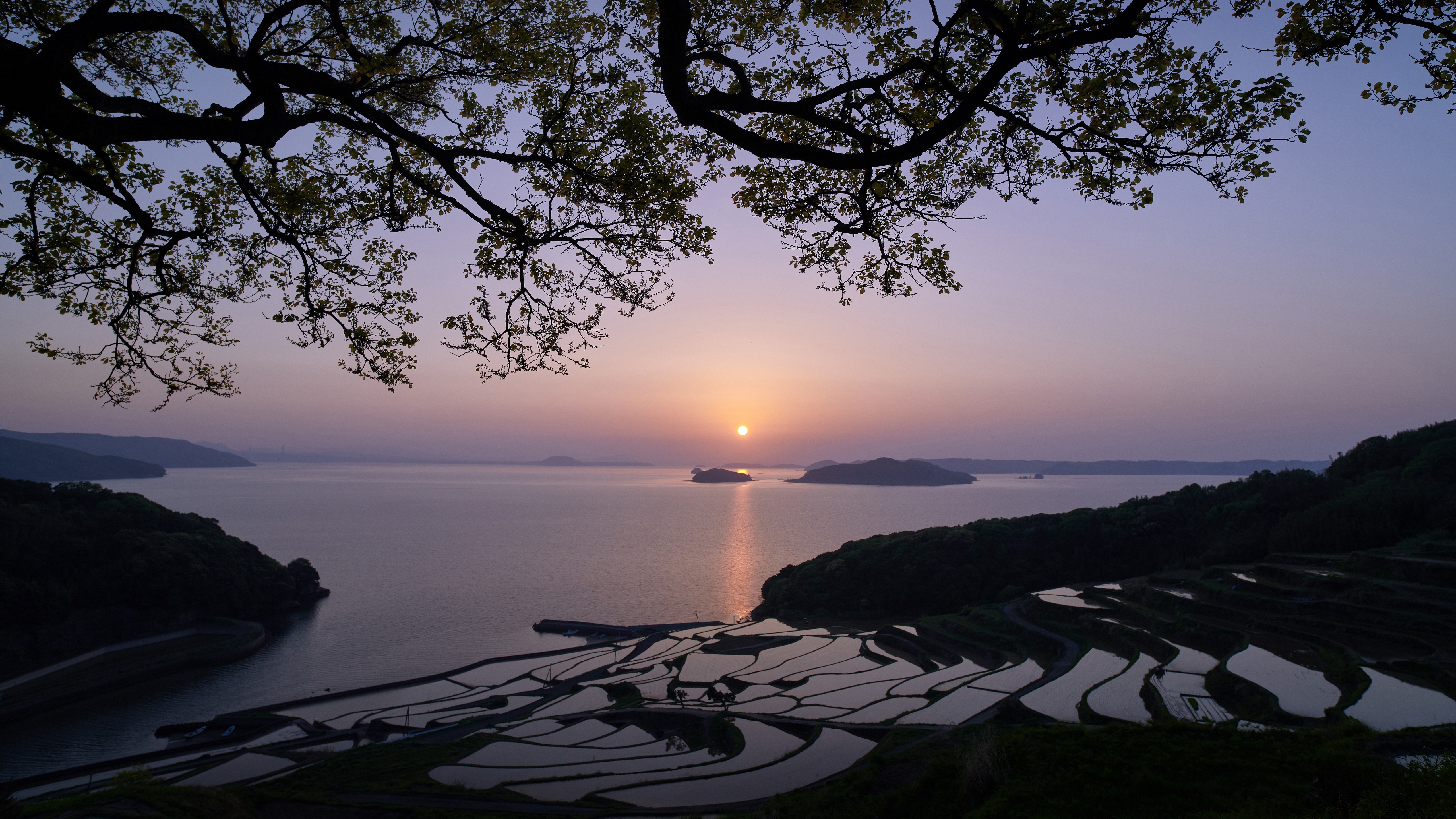 Description: A sunset over a lake with a boat in the water and a tree in the foreground with a boat in the water.