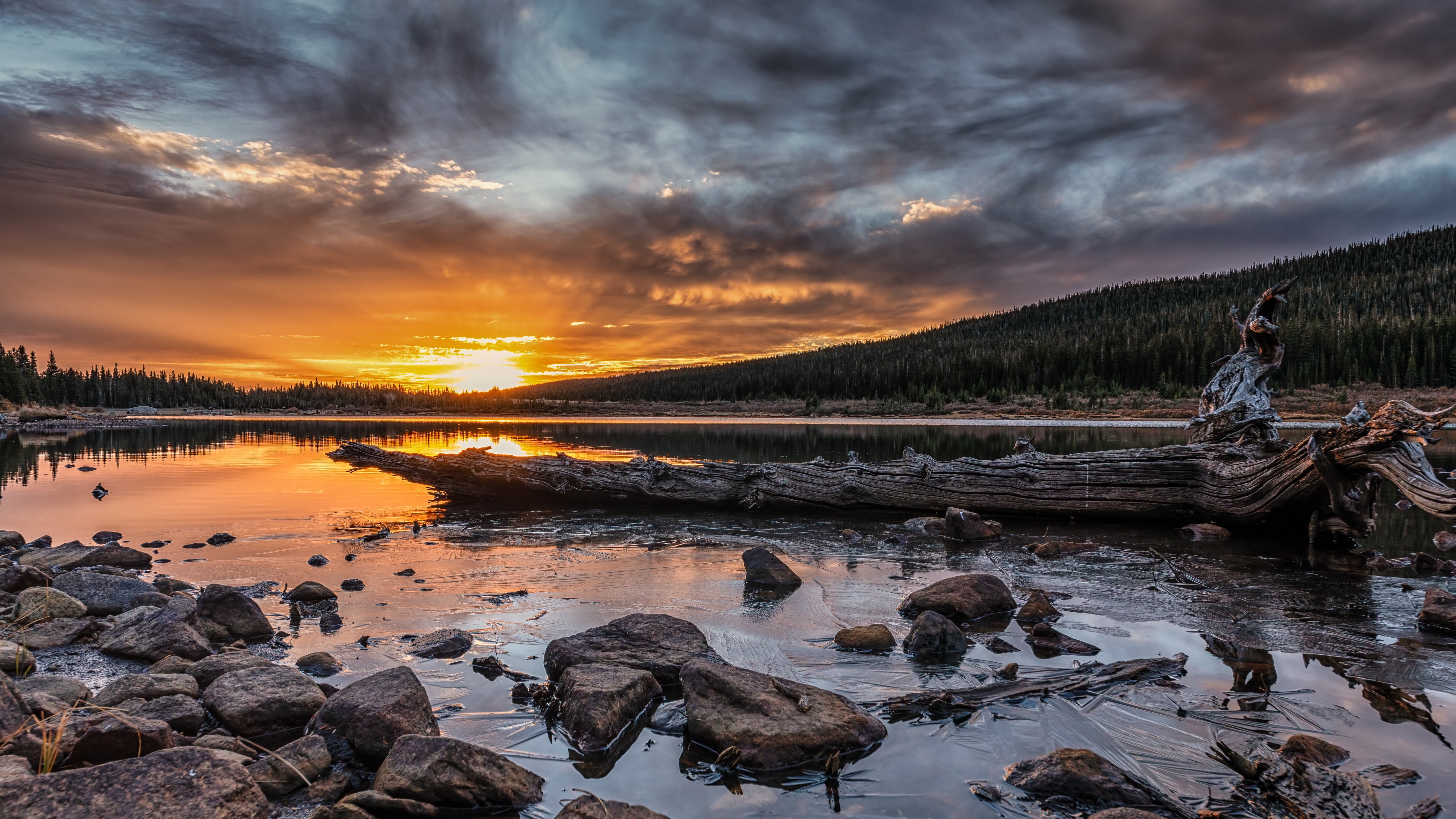 Description: A sunset over a lake with a fallen tree in the foreground and a mountain in the background with clouds.