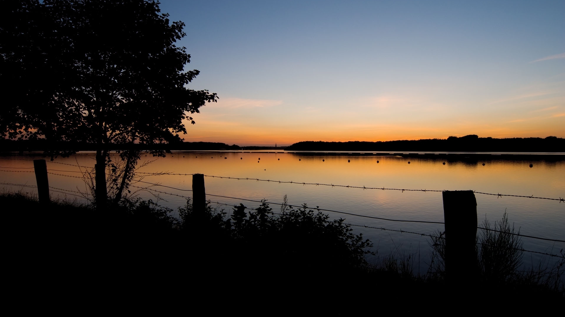 Description: A sunset over a lake with a fence and trees in the foreground and a body of water in the background.