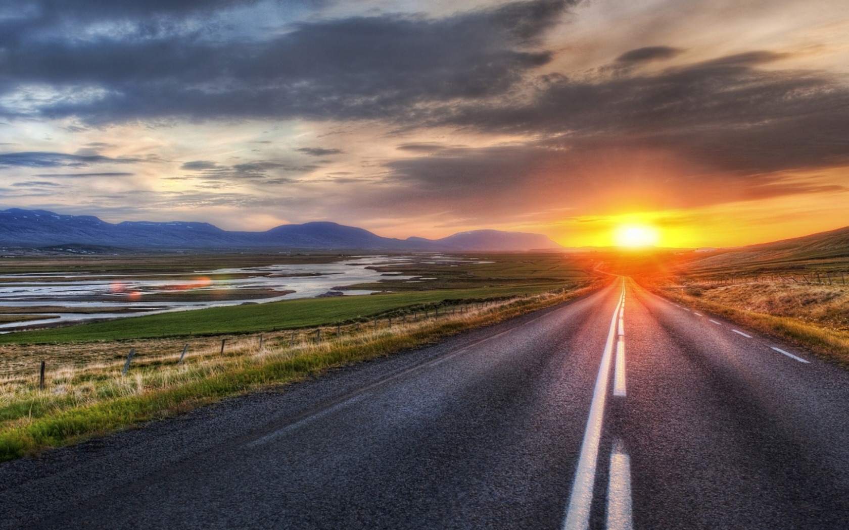 Description: A road with a sunset in the background and a field in the foreground with a lake in the middle.