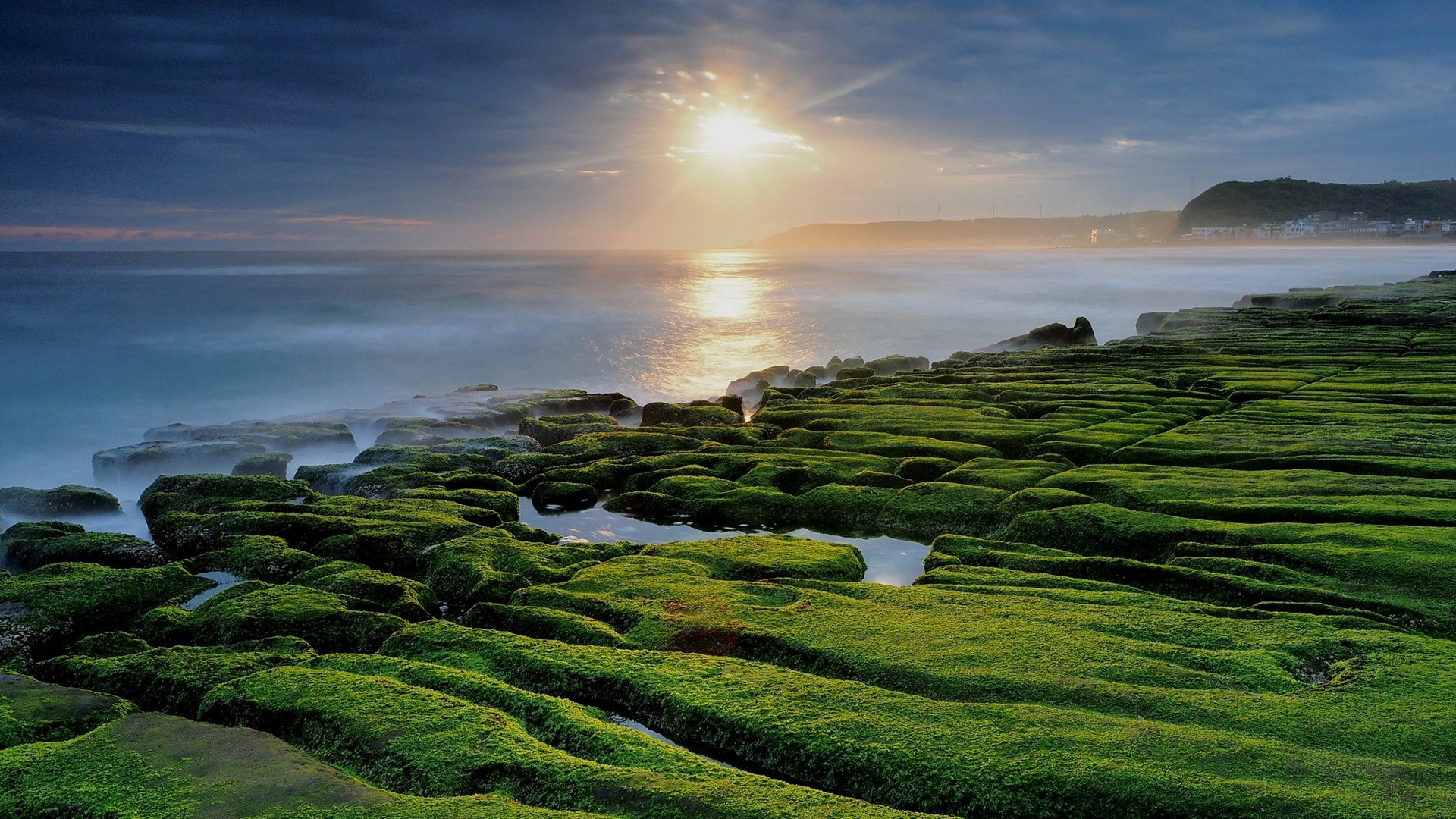 Description: A large body of water surrounded by green moss covered rocks and a cliff face covered in water with a sun setting in the background.