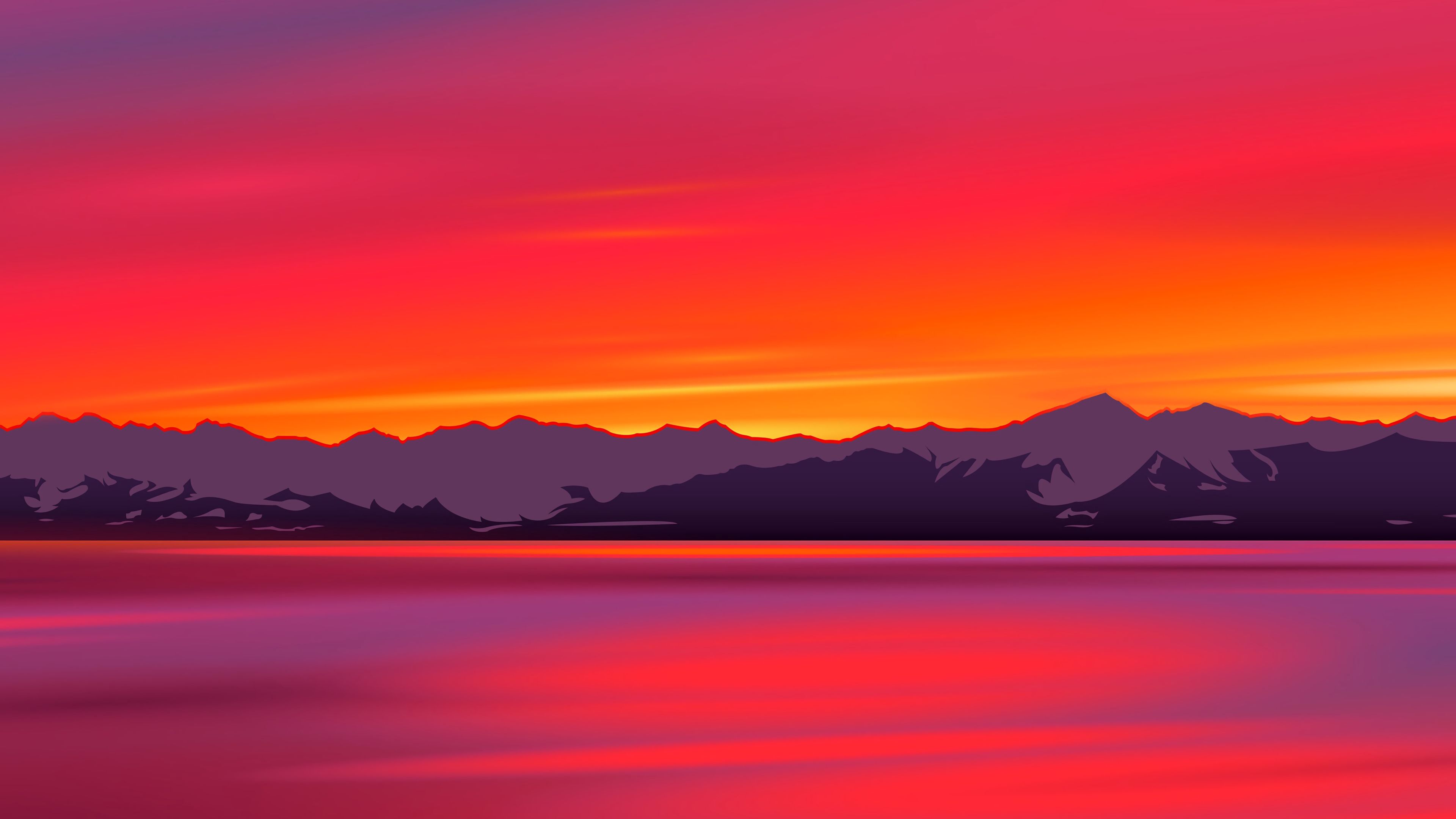 Description: A painting of a sunset over a lake with mountains in the background and a red sky with clouds in the foreground.