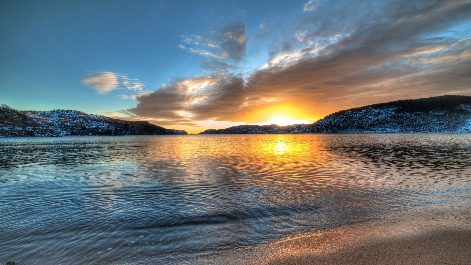 Description: A sunset over a lake with mountains in the background and a body of water in the foreground with a few waves coming in.