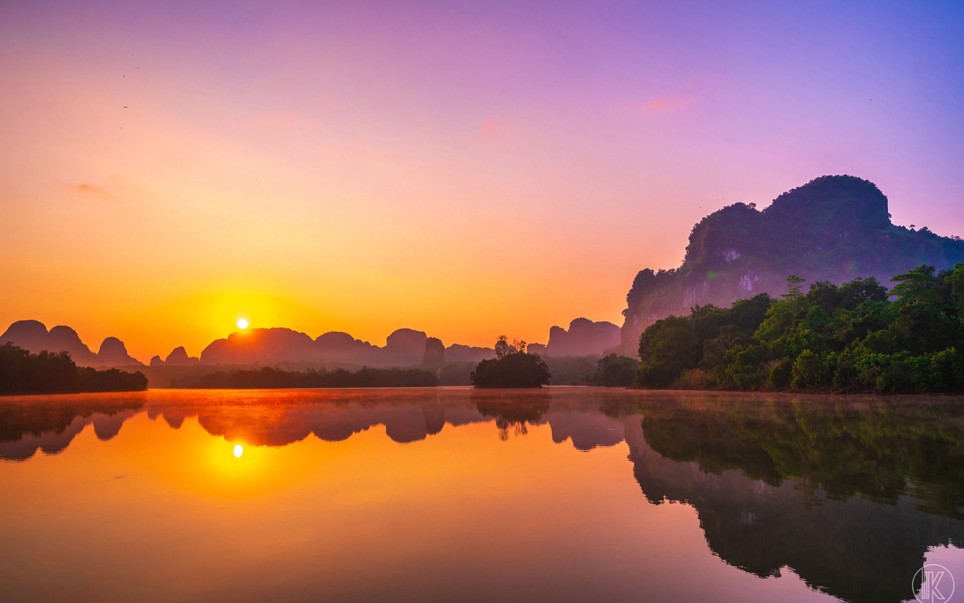Description: A beautiful sunset over a lake with mountains in the background and a few trees in the foreground.