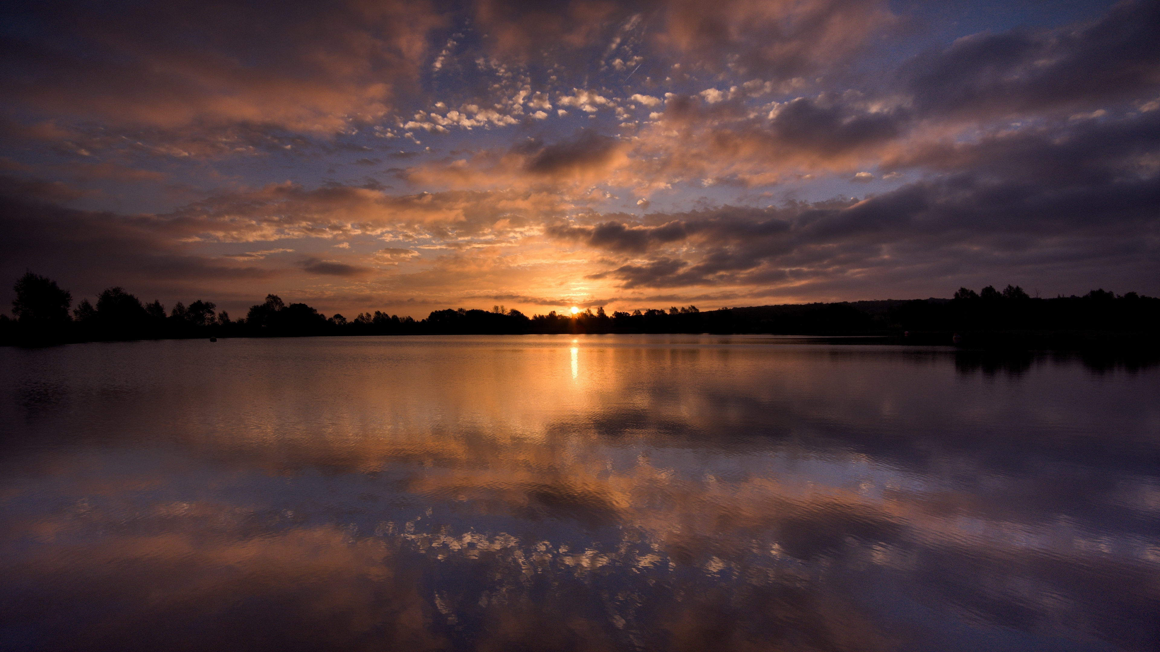 Description: A sunset over a lake with clouds reflecting in the water and trees in the distance with a few clouds.
