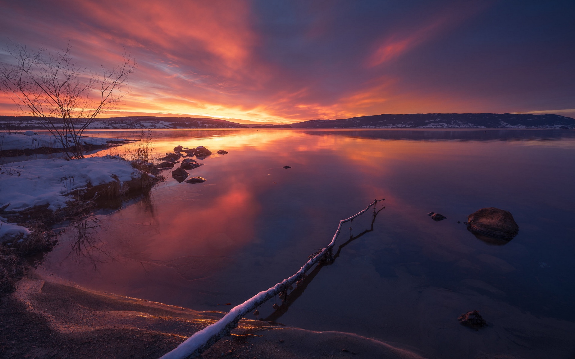 Description: A sunset over a lake with a few rocks in the water and a few trees in the foreground.