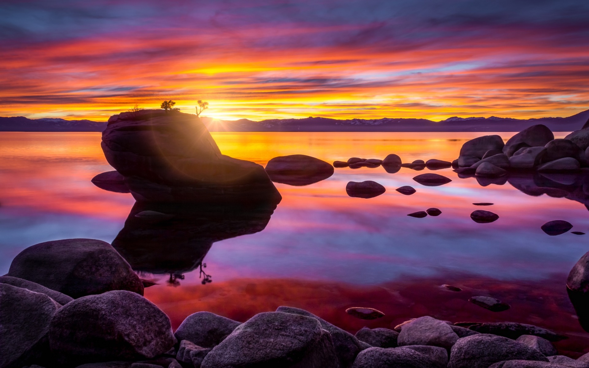 Description: A sunset over a lake with rocks and water in the foreground and a person standing on a rock.