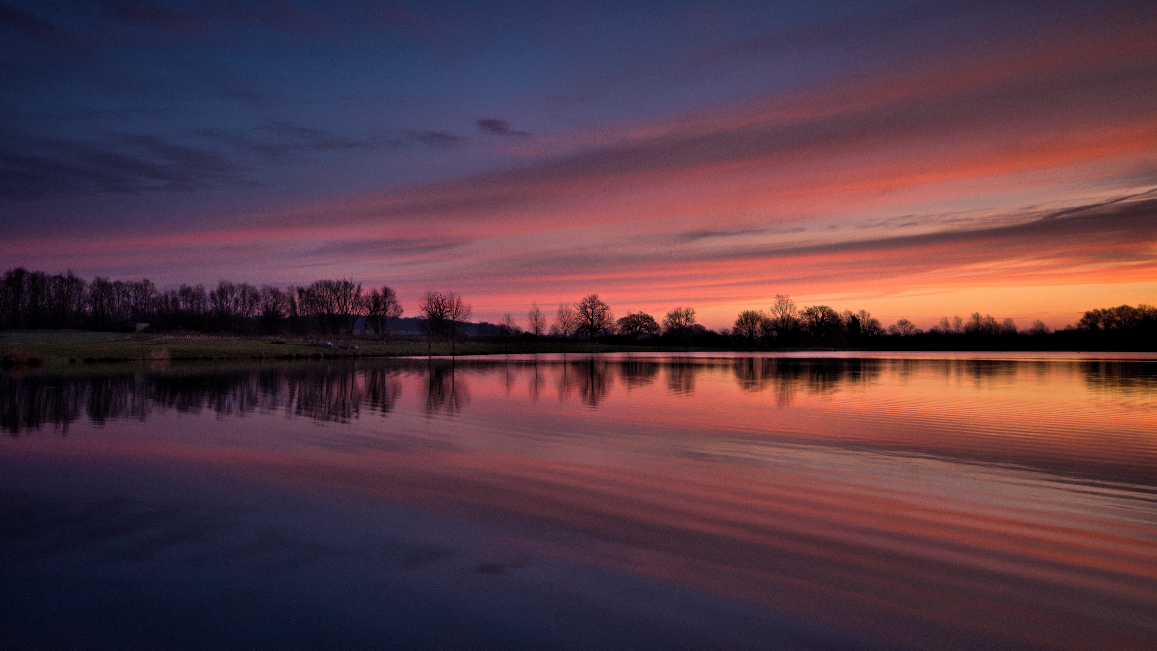 Description: A sunset over a lake with a few clouds in the sky and trees in the background and a few clouds in the sky.