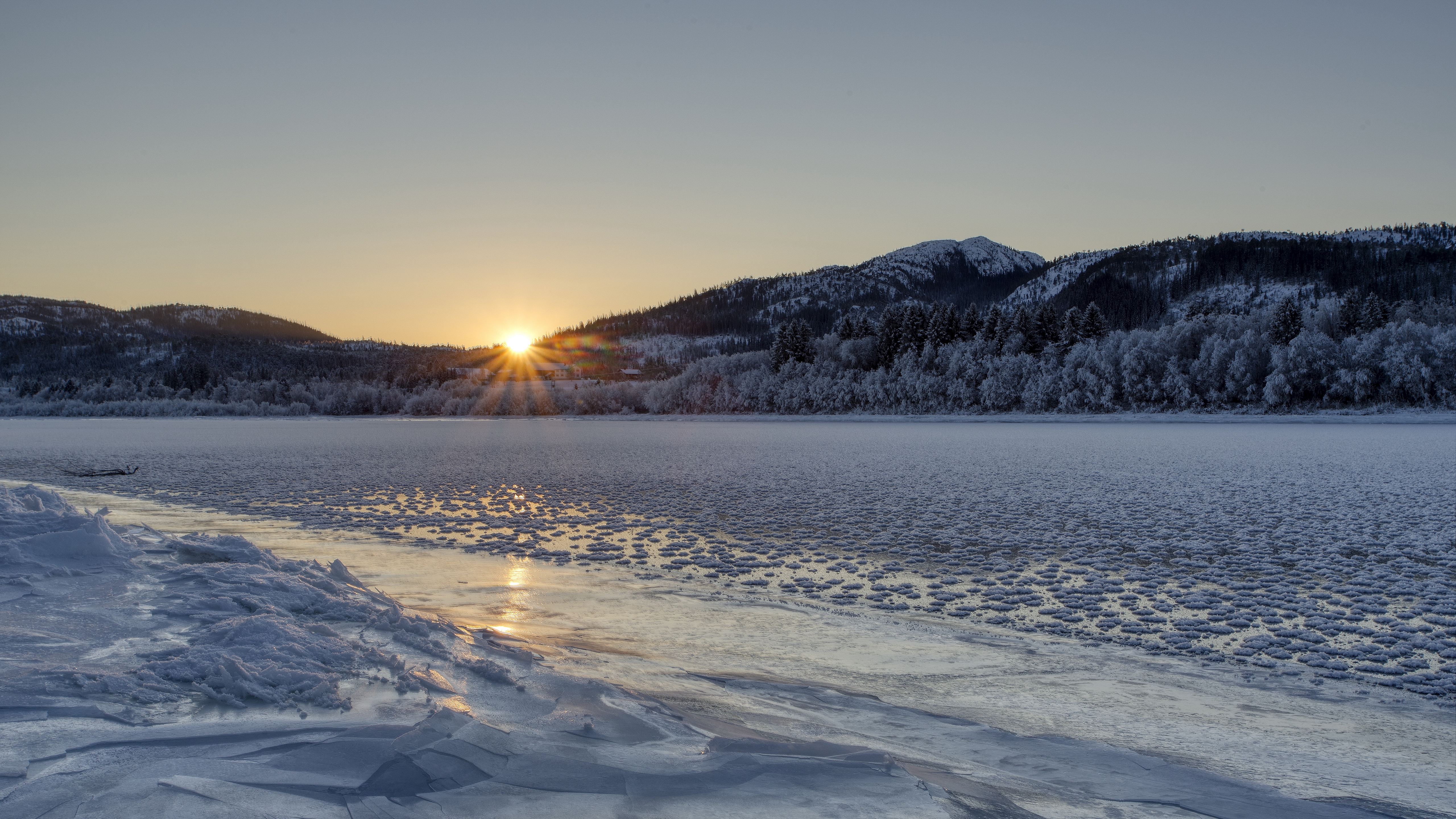 Description: A sunset over a lake with snow on the ground and mountains in the background with a sun setting in the distance.