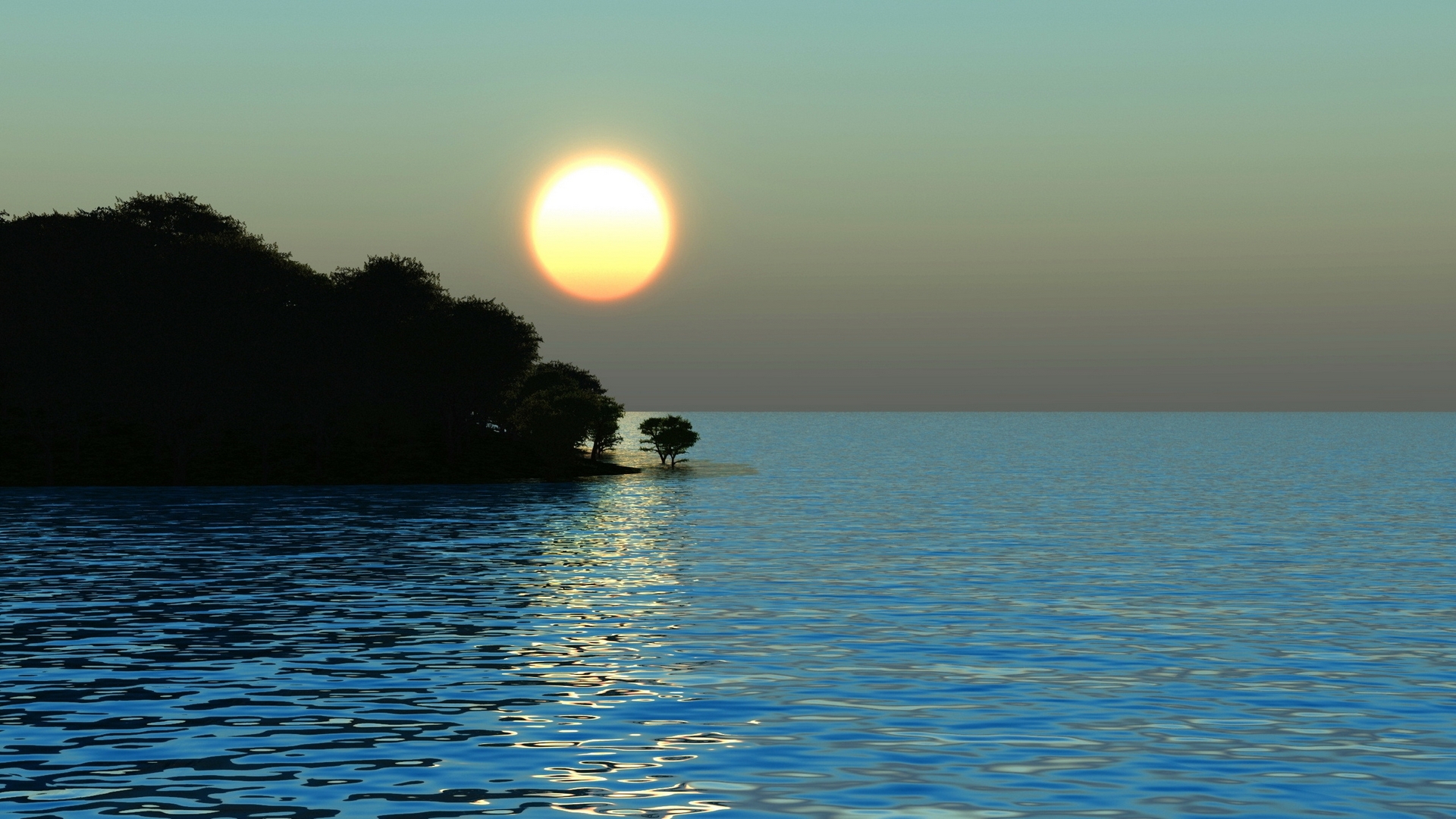 Description: A sunset over a body of water with a tree in the middle of the water and a small island in the middle of the water.