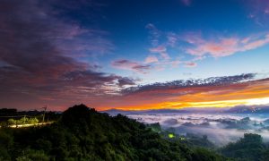 Description: A sunset view of a mountain with clouds and a city below it and a few lights on the top of the mountain.