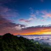 Description: A view of a sunset over a mountain with clouds and trees below it and a blue sky with a few clouds.