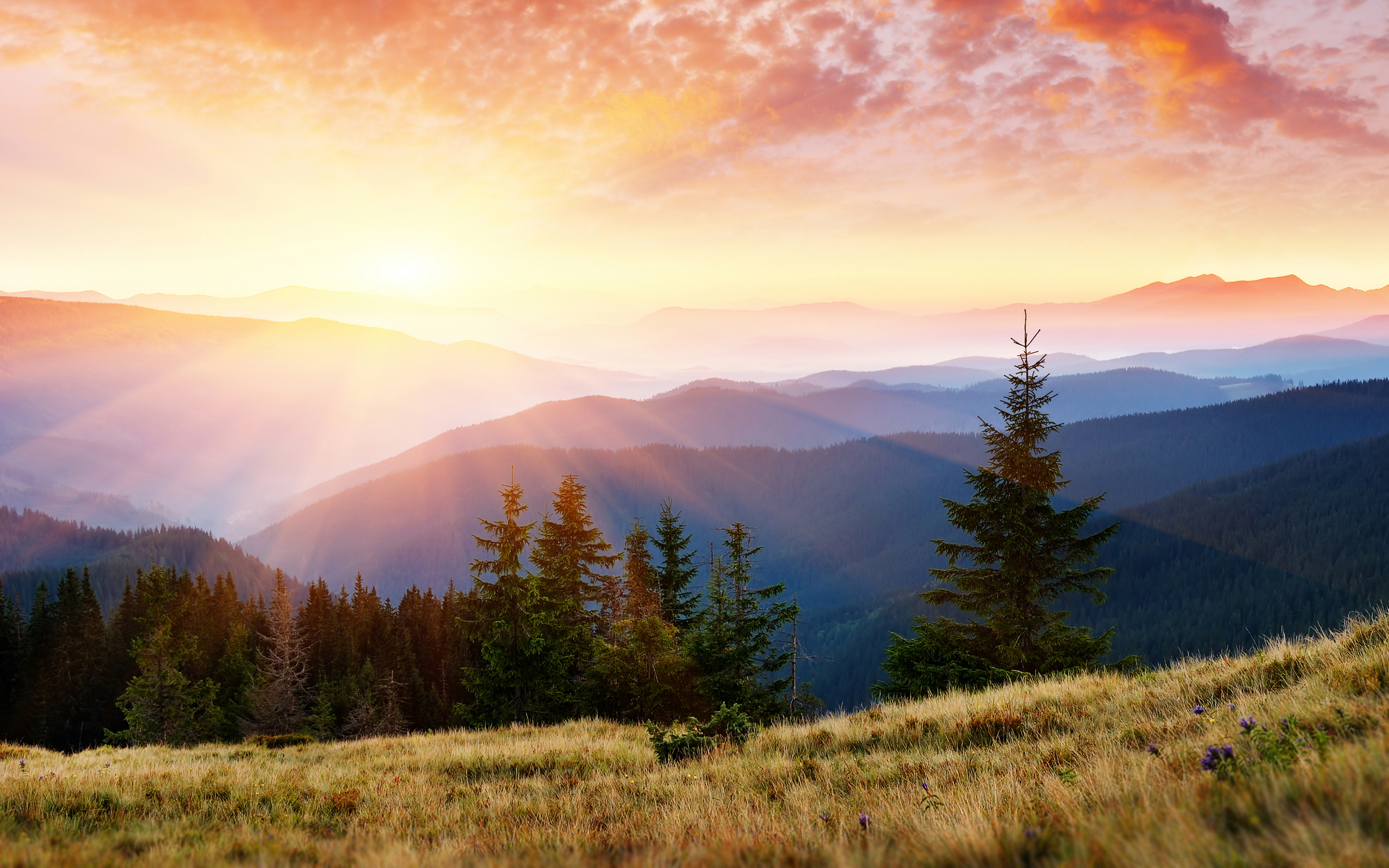 Description: A beautiful sunset over a mountain range with trees and grass on the hillside and a few clouds in the sky.