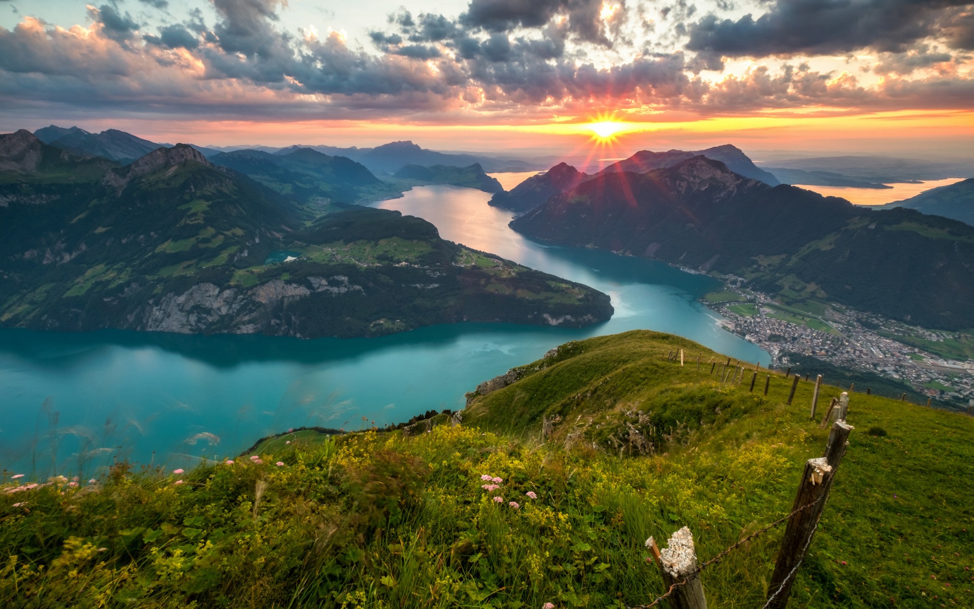 Description: A beautiful sunset over a mountain with a lake in the foreground and a city in the distance with mountains in the background.