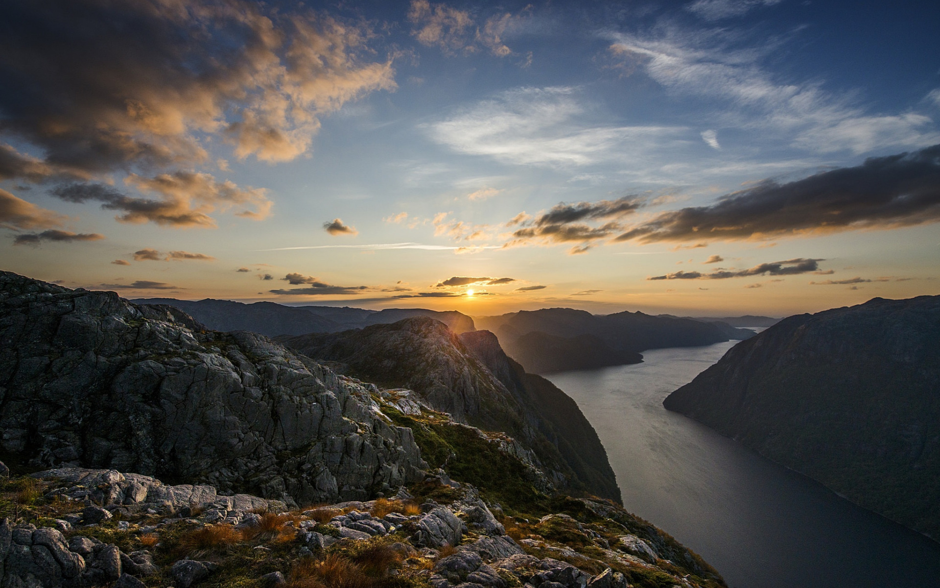 Description: A sunset over a mountain with a body of water in the distance and a few clouds in the sky.