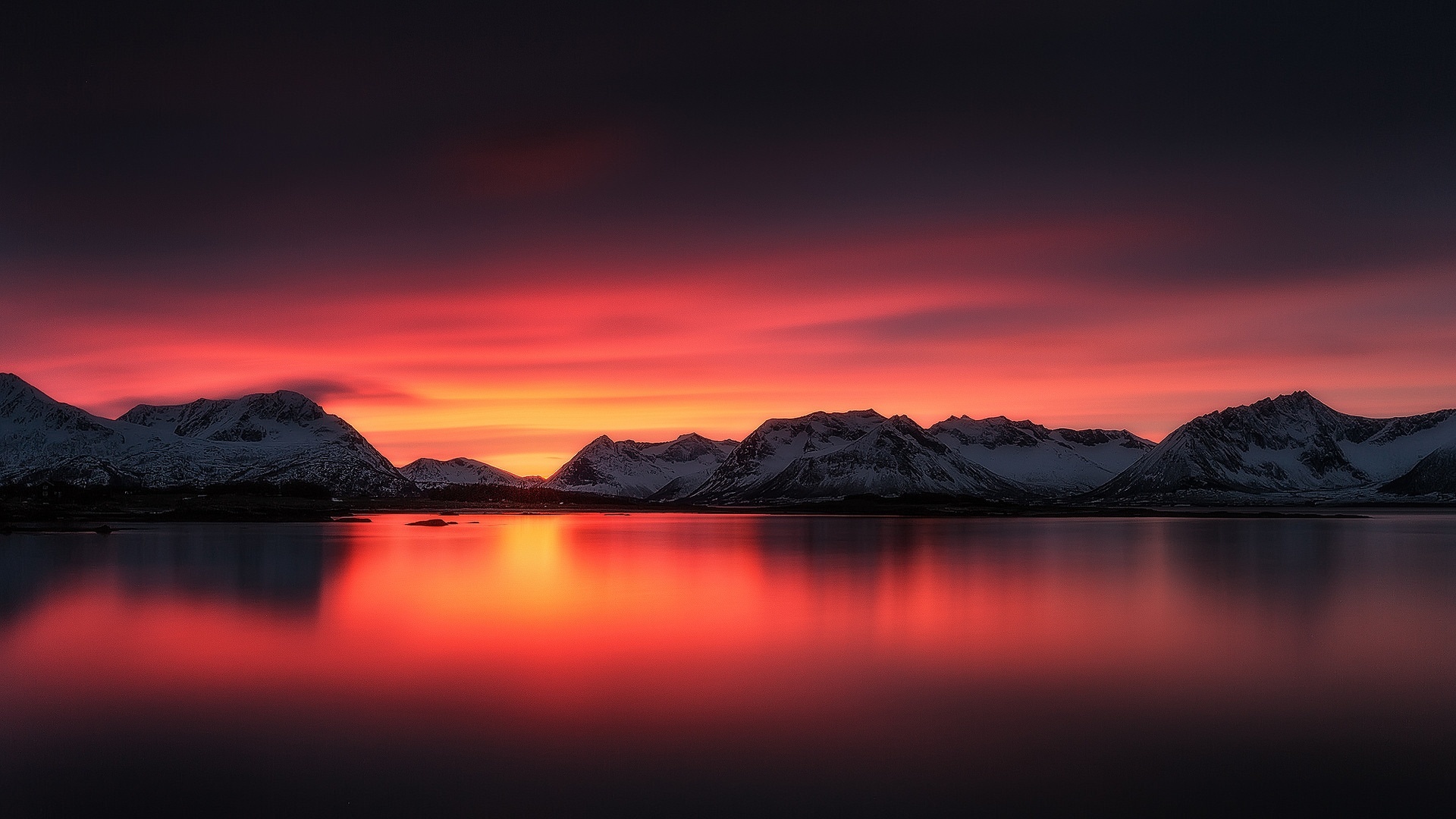 Description: A sunset over a mountain range with a lake in the foreground and a few snow capped mountains in the background.