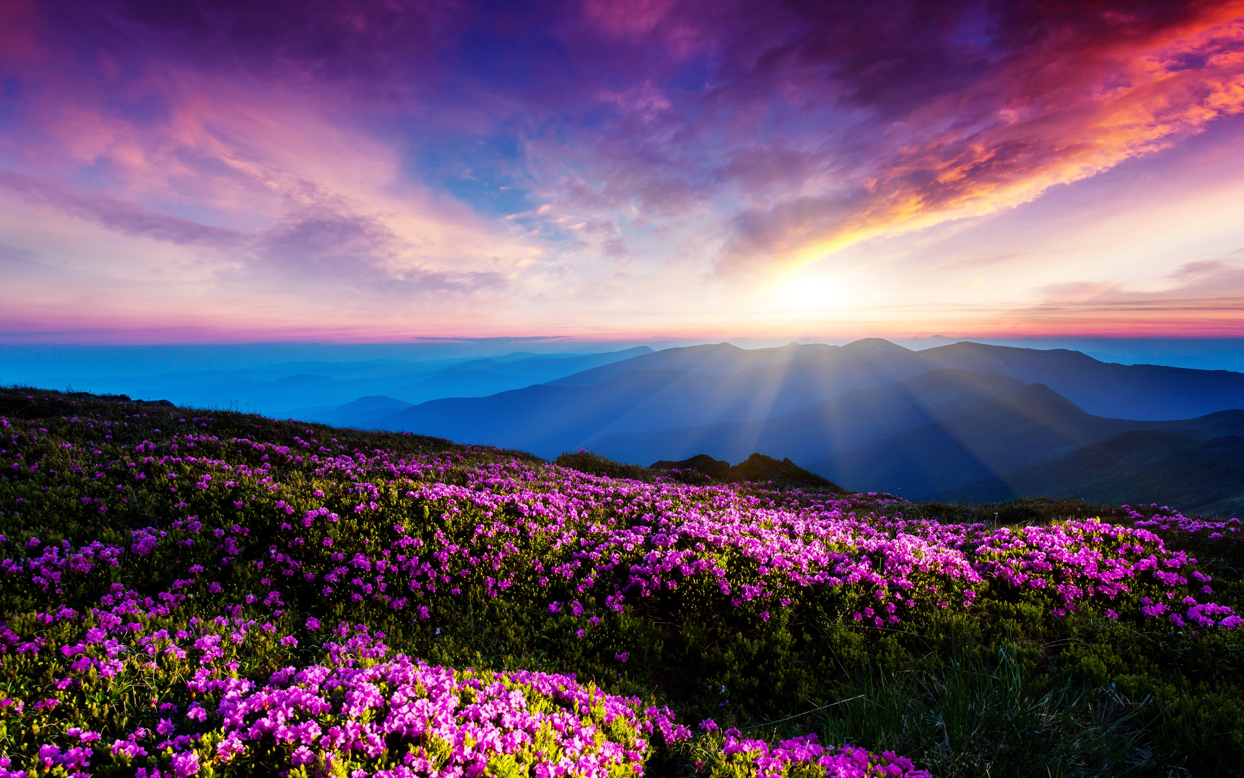 Description: A beautiful sunset over a mountain with purple flowers in the foreground and a purple sky in the background.