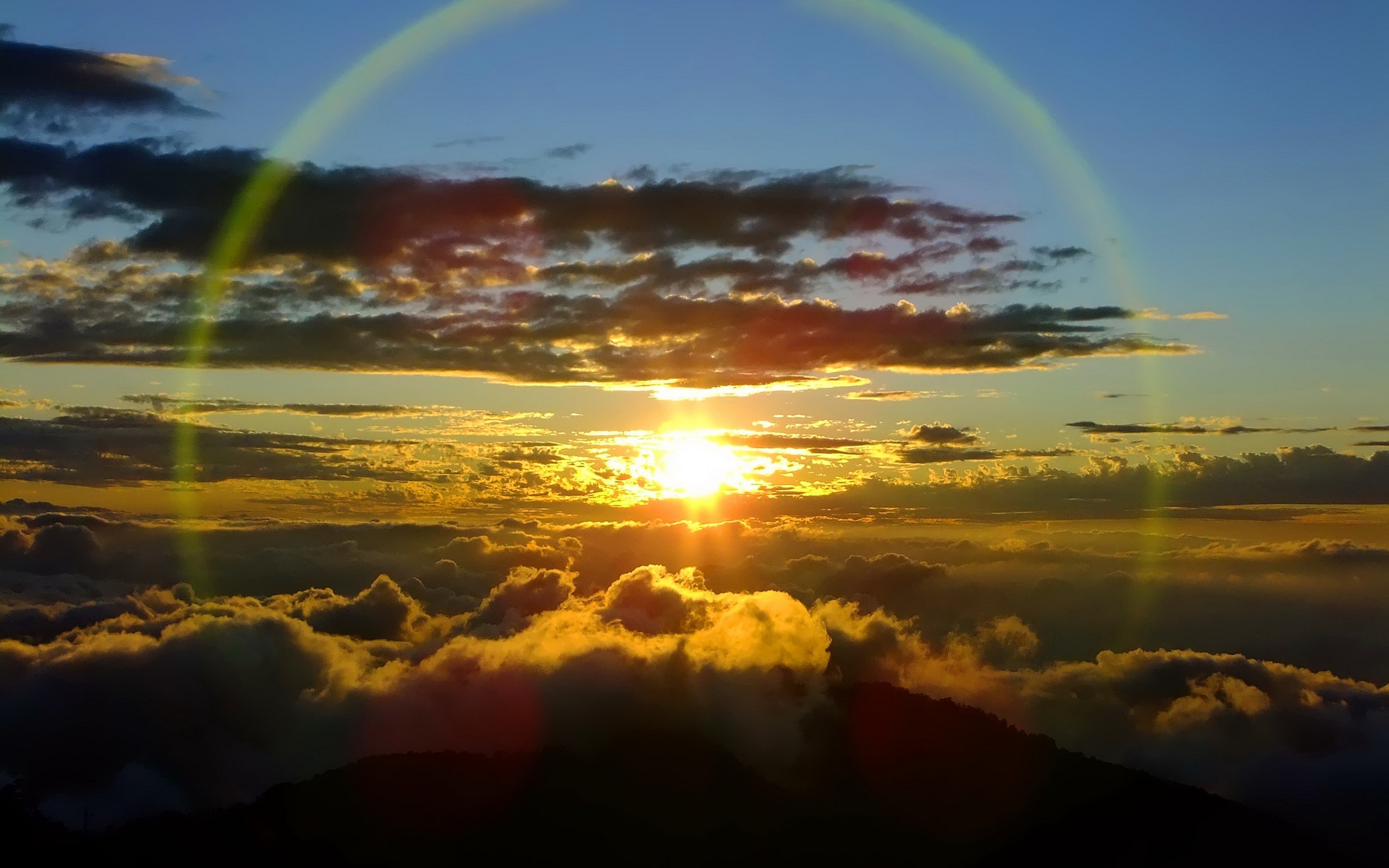 Description: A sun setting over a mountain with clouds below it and a rainbow in the sky above it with a halo.
