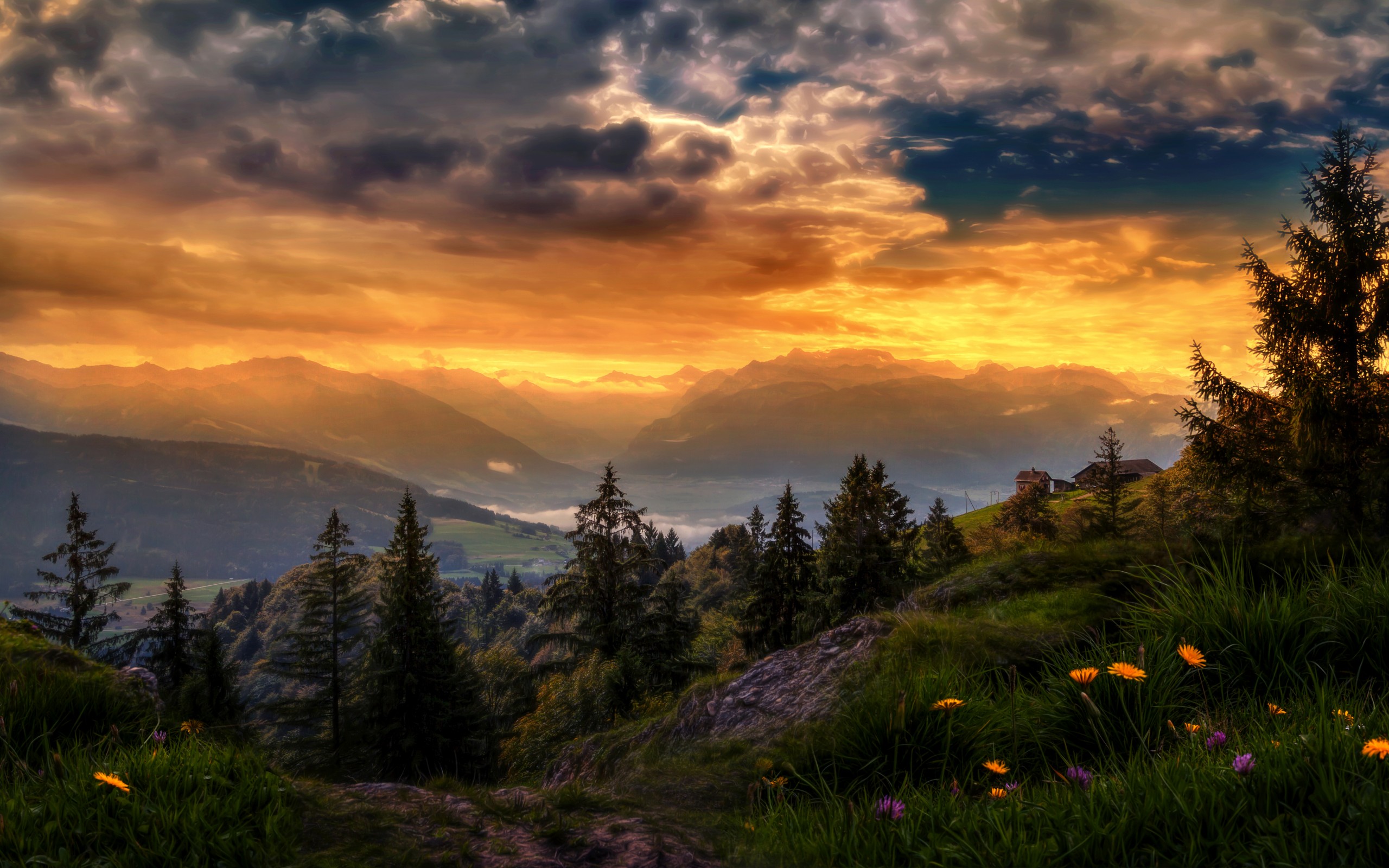 Description: A sunset view of a mountain range with a forest and flowers in the foreground and a cloudy sky.